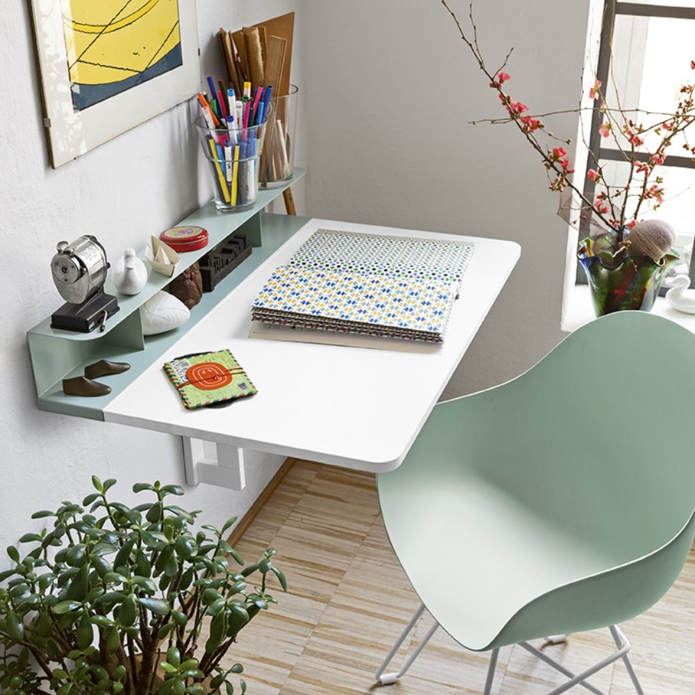 Komplett mit einem lackierten Metallregal, erhältlich in verschiedenen Farben, das nicht nur dem Tisch Halt gibt, sondern auch einen Hauch von Farbe und Personalisierung verleiht.