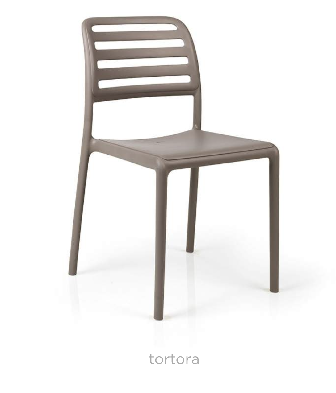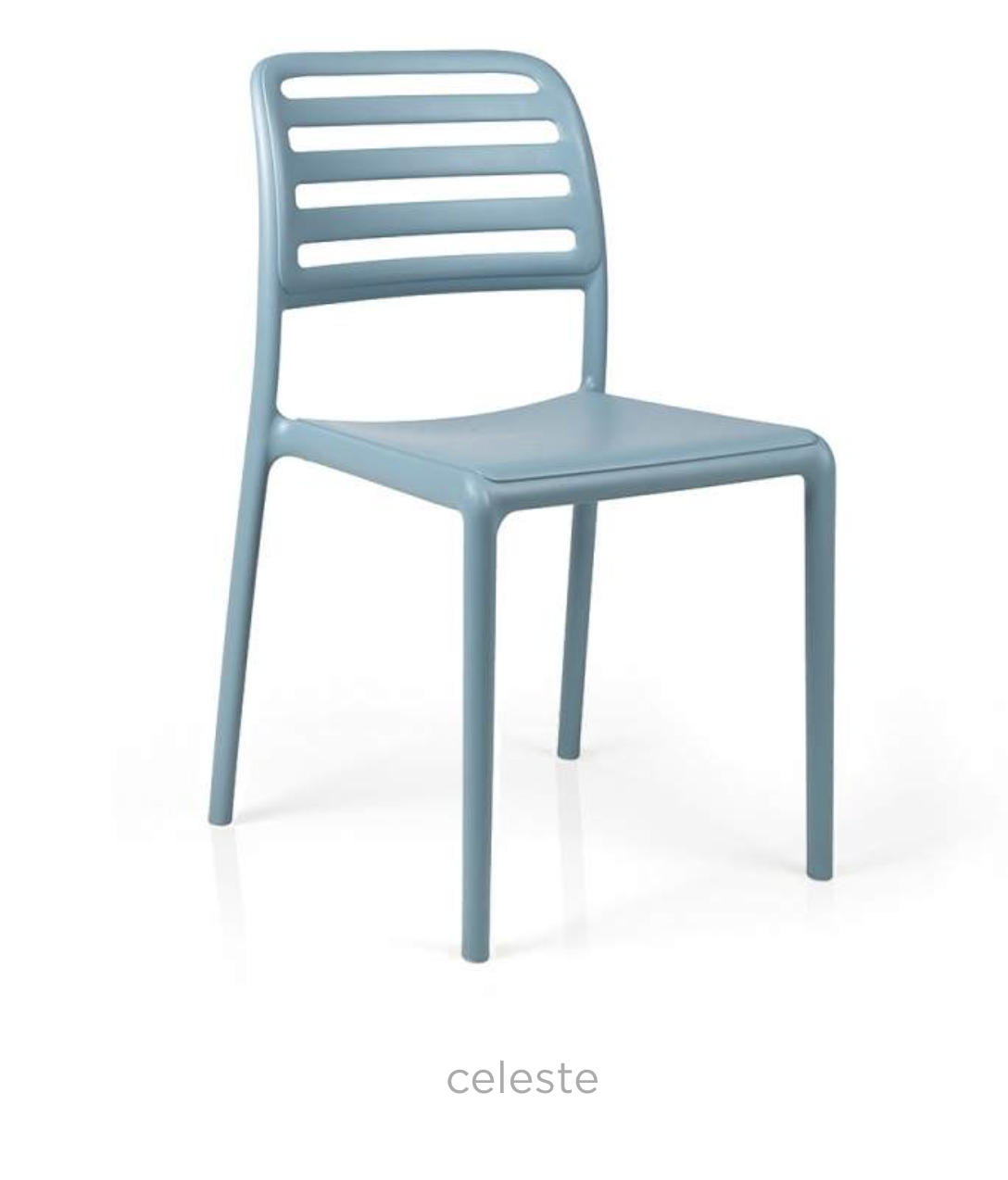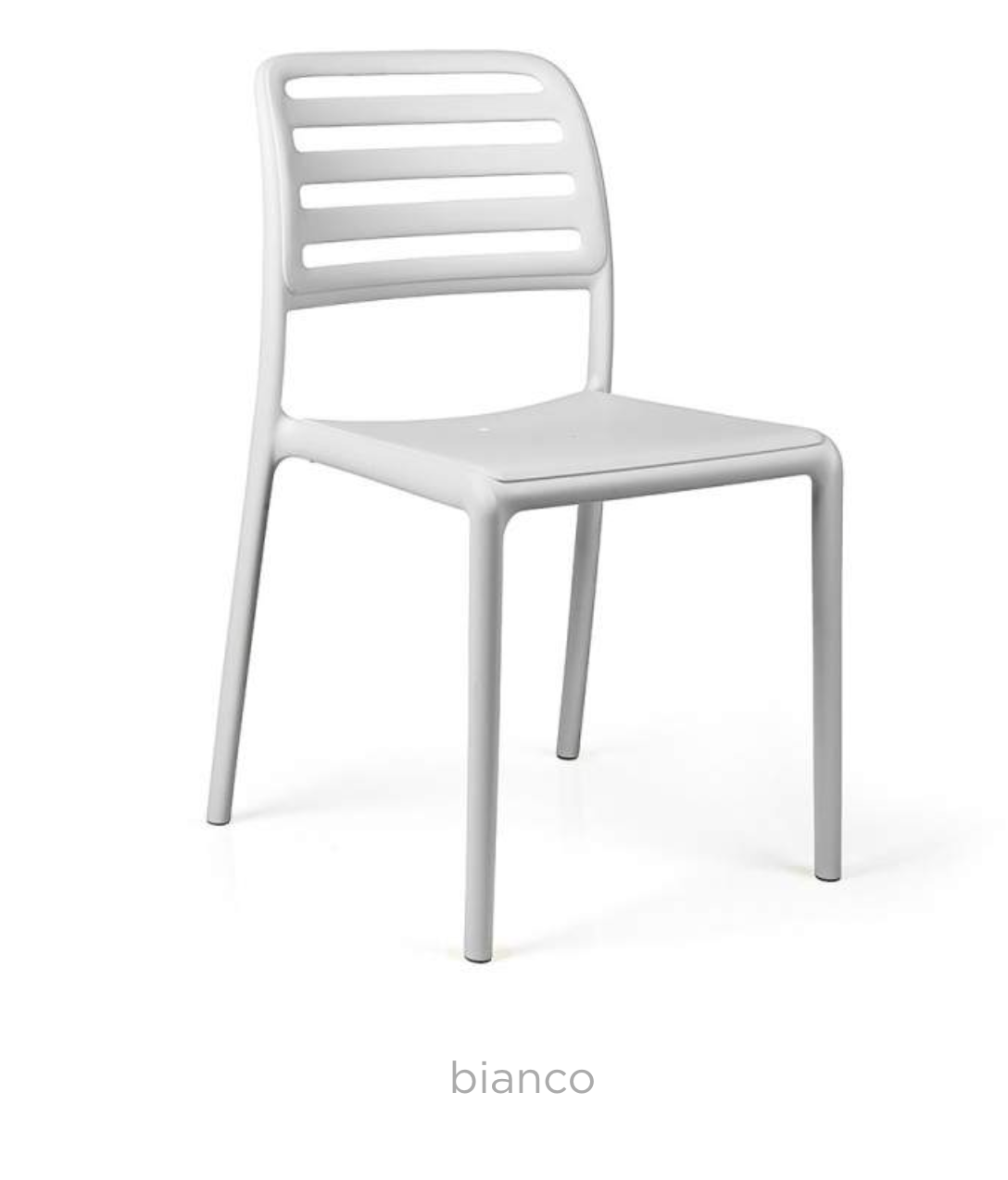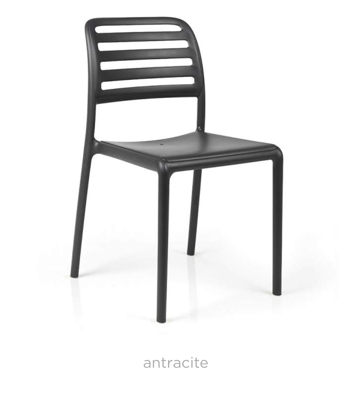 Grundlegende Linien für einen leichten, praktischen und bequemen Sitz ohne Armlehnen. Costa ist ein Outdoor-Stuhl mit einer Lattenrückenlehne aus Glasfaserharz: ein einzelnes Harzrohr ohne Unterbrechungen mit abgerundeten Profilen und Ecken.