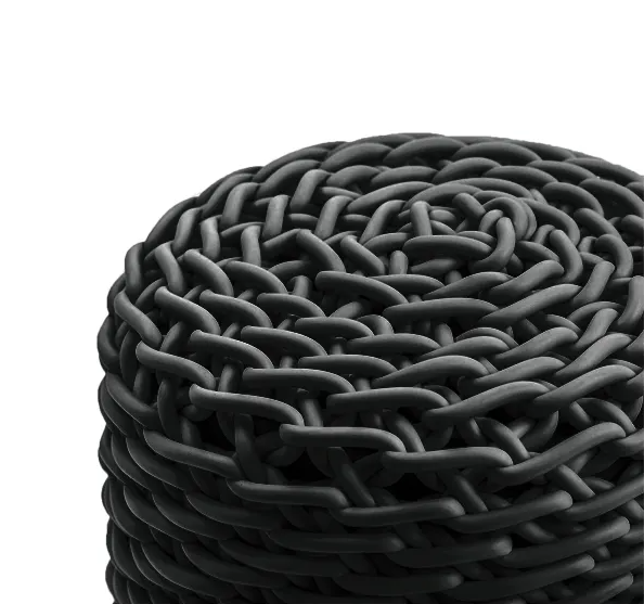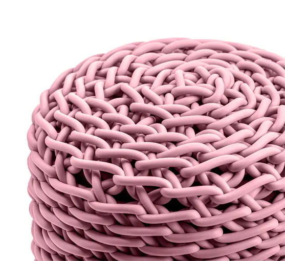 Gestrickte Poufs aus gewebtem Gummifaden vereinen Handwerkskunst und Nachhaltigkeit in einem raffinierten und bequemen Design.
