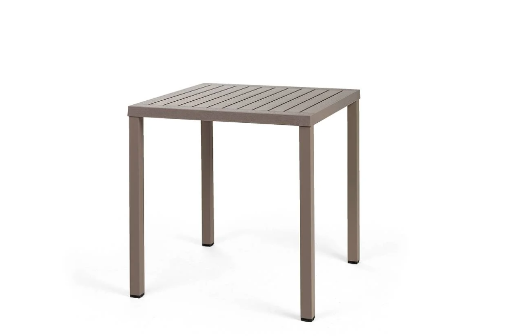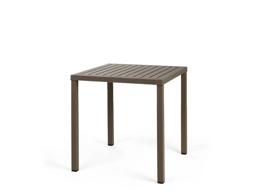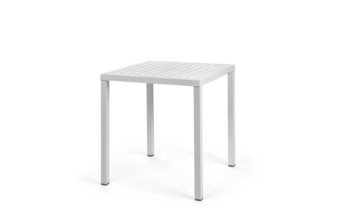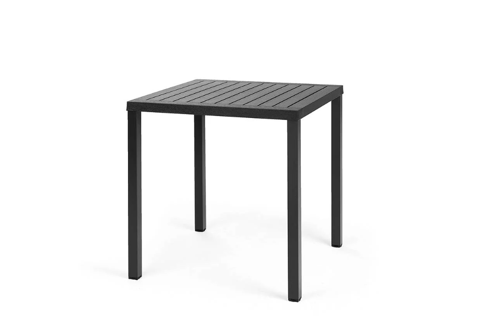 Stapelbarer Tisch. Material: DurelTOP-Platte aus UV-behandeltem Polypropylen, durchgefärbt.