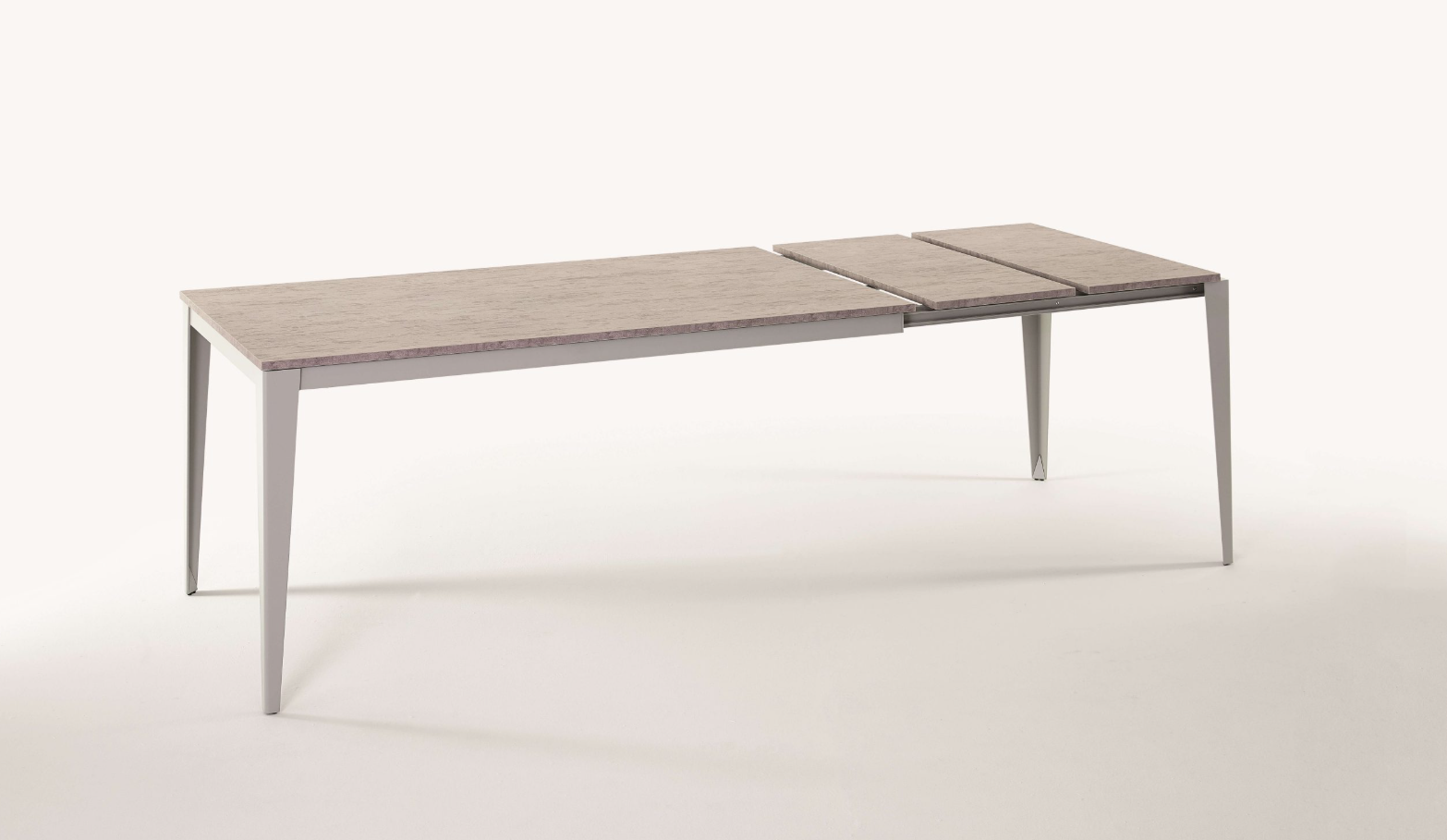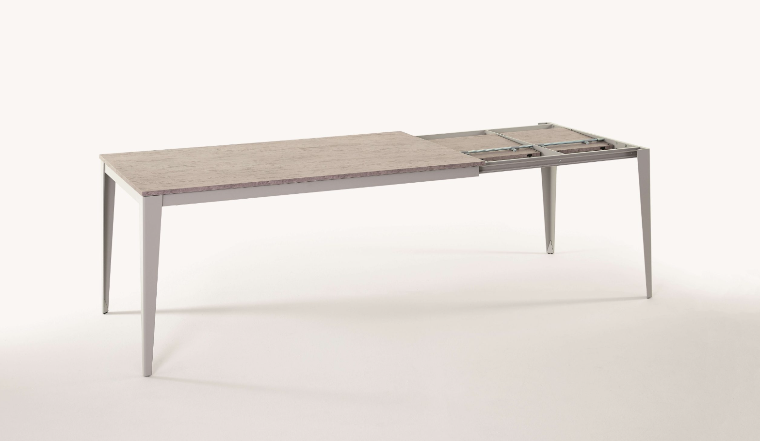 Ausziehbarer Tisch mit schlichtem und modernem Design und einer soliden Struktur aus lackiertem Stahl.