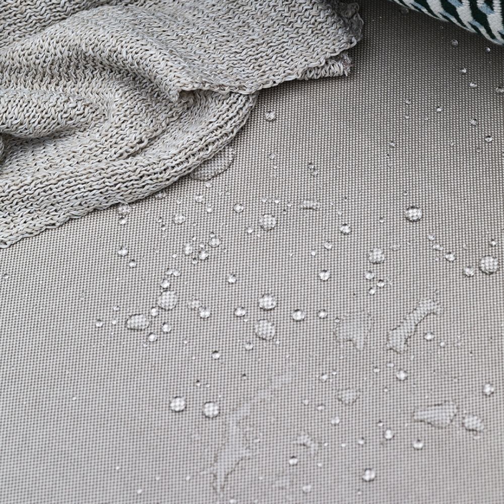 Die Kissen ruhen auf einem verstärkten Lattenrost aus Polypropylen und bieten eine solide und bequeme Unterstützung. Sie sind mit Polyurethanschaum gepolstert und durch eine wasserdichte PVC-Auskleidung geschützt, wodurch sie wasserabweisend und pflegeleicht sind.
