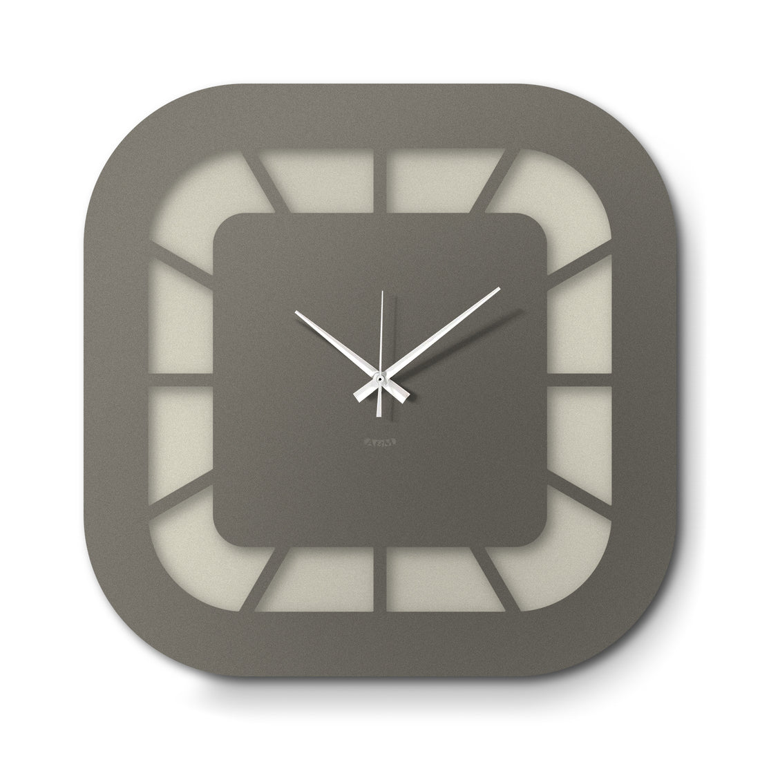 Die Struktur der Uhr basiert auf einem Quadrat mit abgerundeten Ecken, das sich sowohl im zentralen Zifferblatt als auch im äußeren Rahmen wiederholt. Das Zifferblatt, bewusst kleiner als die Gesamtstruktur, ist durch dünne, nach außen gerichtete Linien mit dieser verbunden, wodurch ein klarer und leichter grafischer Effekt entsteht. Der untere Teil des Zifferblatts hebt sich durch eine andere Farbe vom Rest ab und führt ein visuelles Detail ein, das die Symmetrie aufbricht und dem gesamten Stück Charakter verleiht.