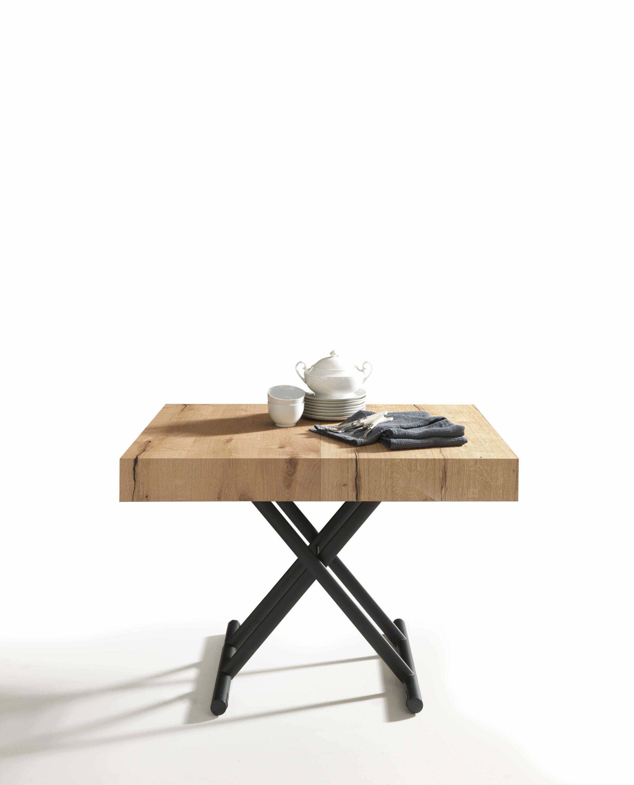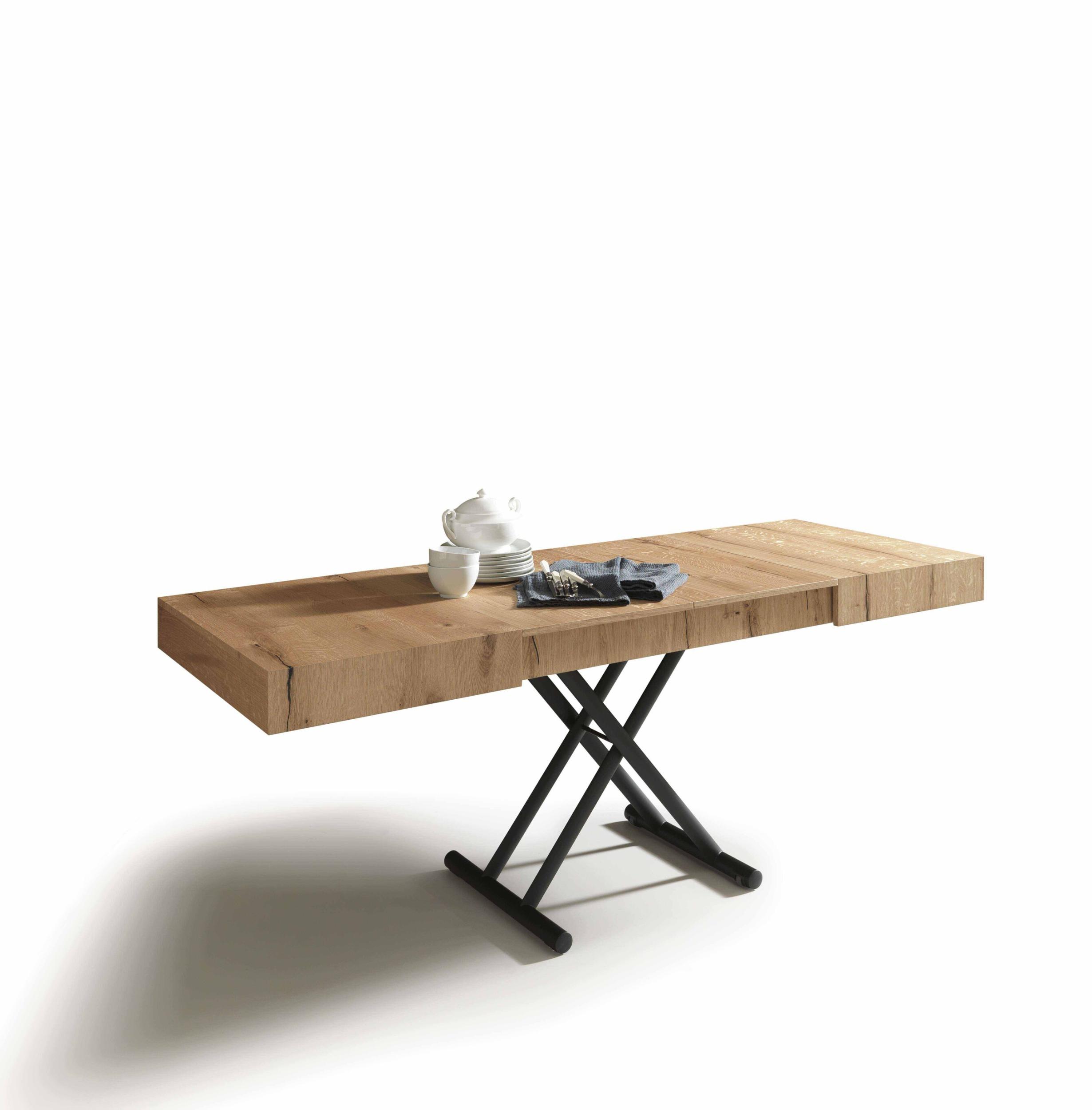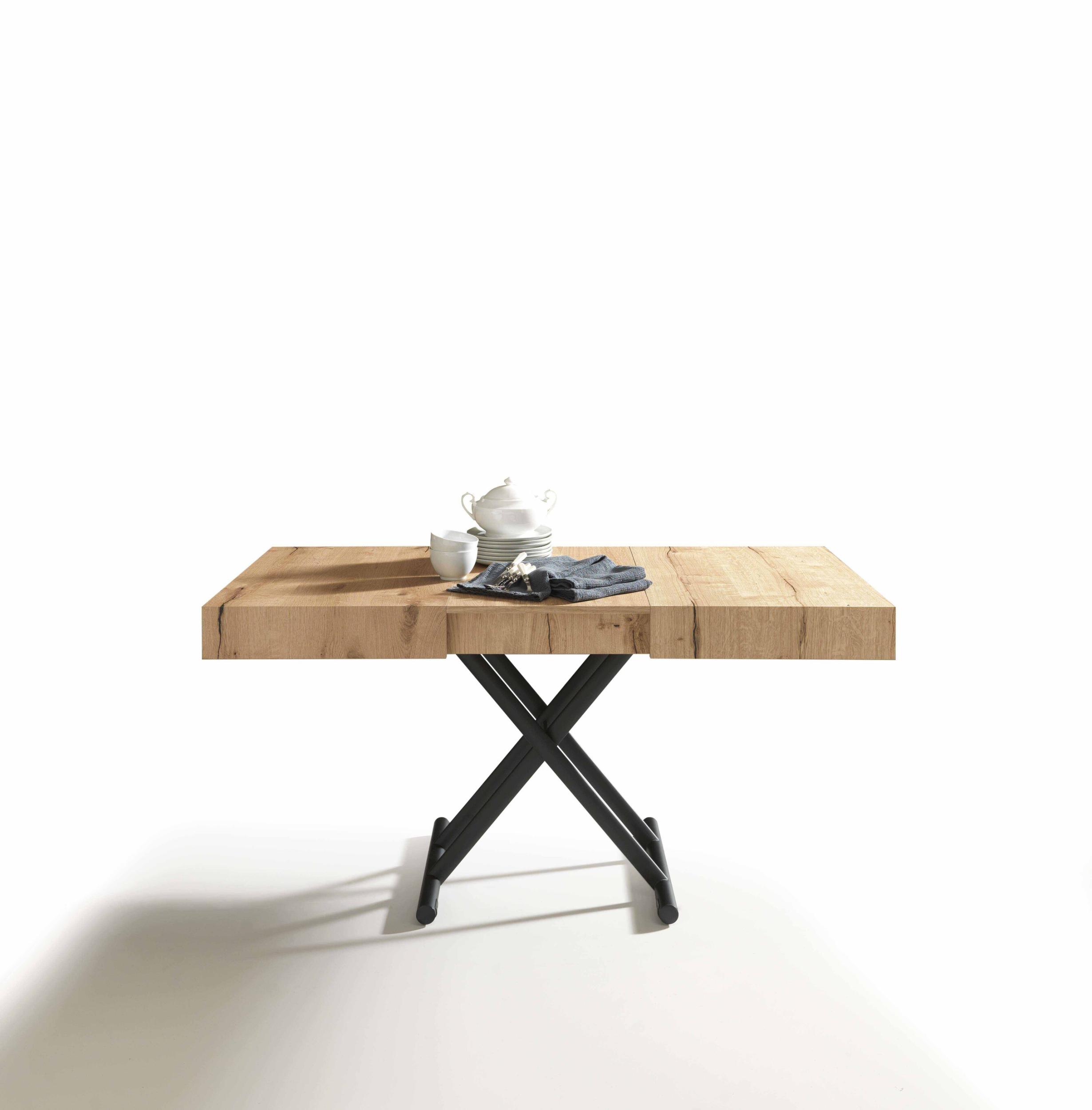 Couchtisch umwandelbar in einen Esstisch, Metallbasis, Gasmechanismus, millimetergenau höhenverstellbar von 28 cm bis 80 cm, rechteckige Platte aus Melamin, lackiert, Holz- oder Mörteleffekt.