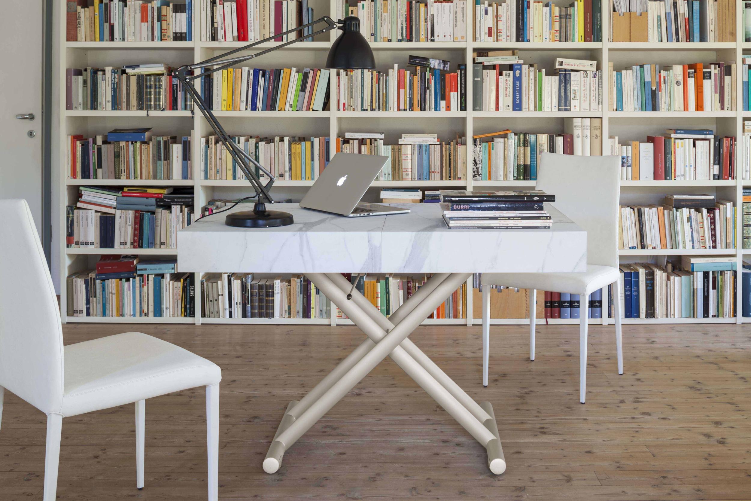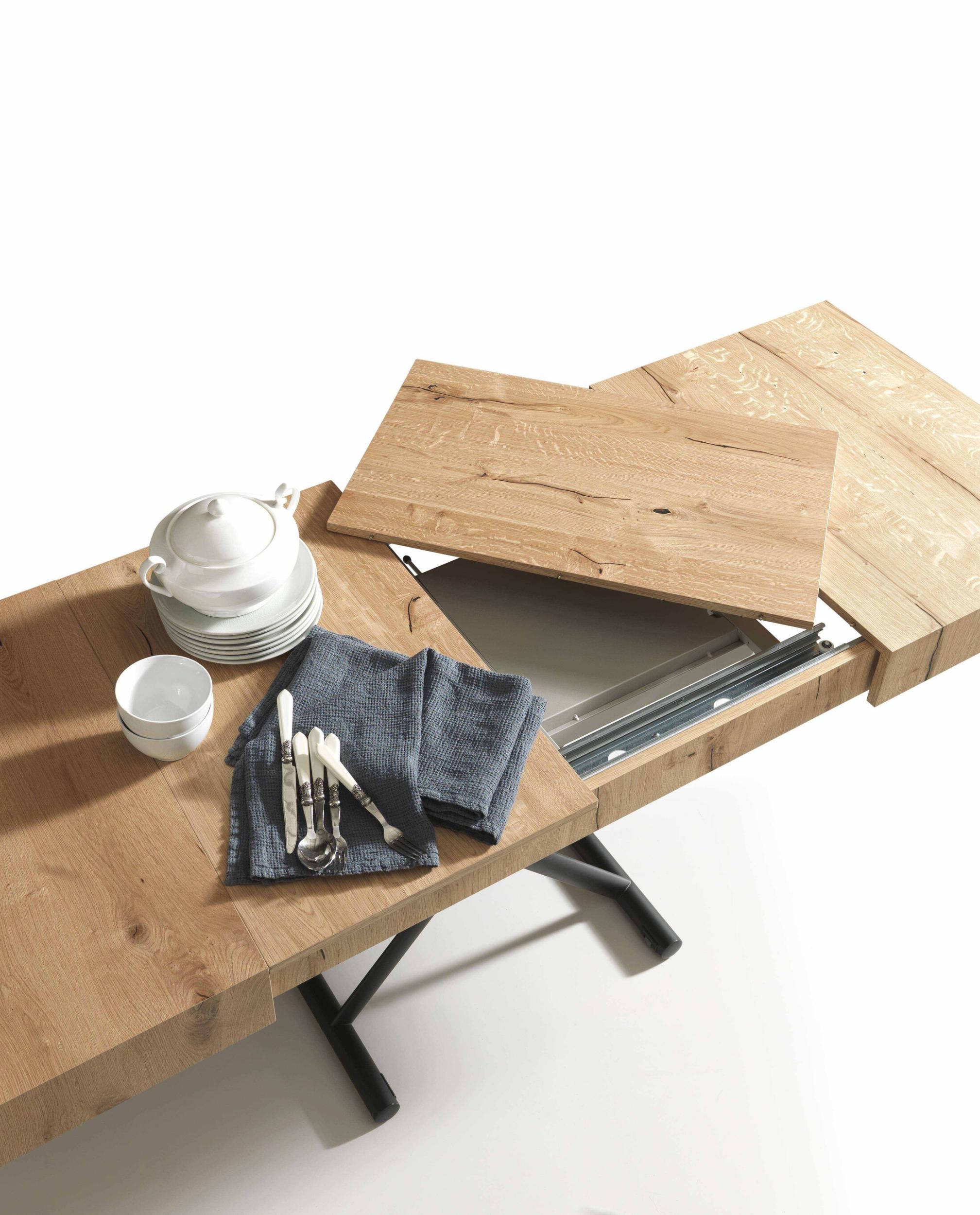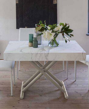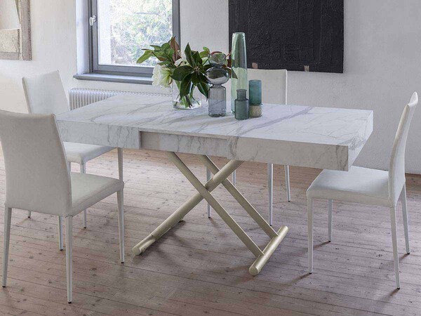 Couchtisch umwandelbar in einen Esstisch, Metallbasis, Gasmechanismus, millimetergenau höhenverstellbar von 28 cm bis 80 cm, rechteckige Platte aus Melamin, lackiert, Holz- oder Mörteleffekt.