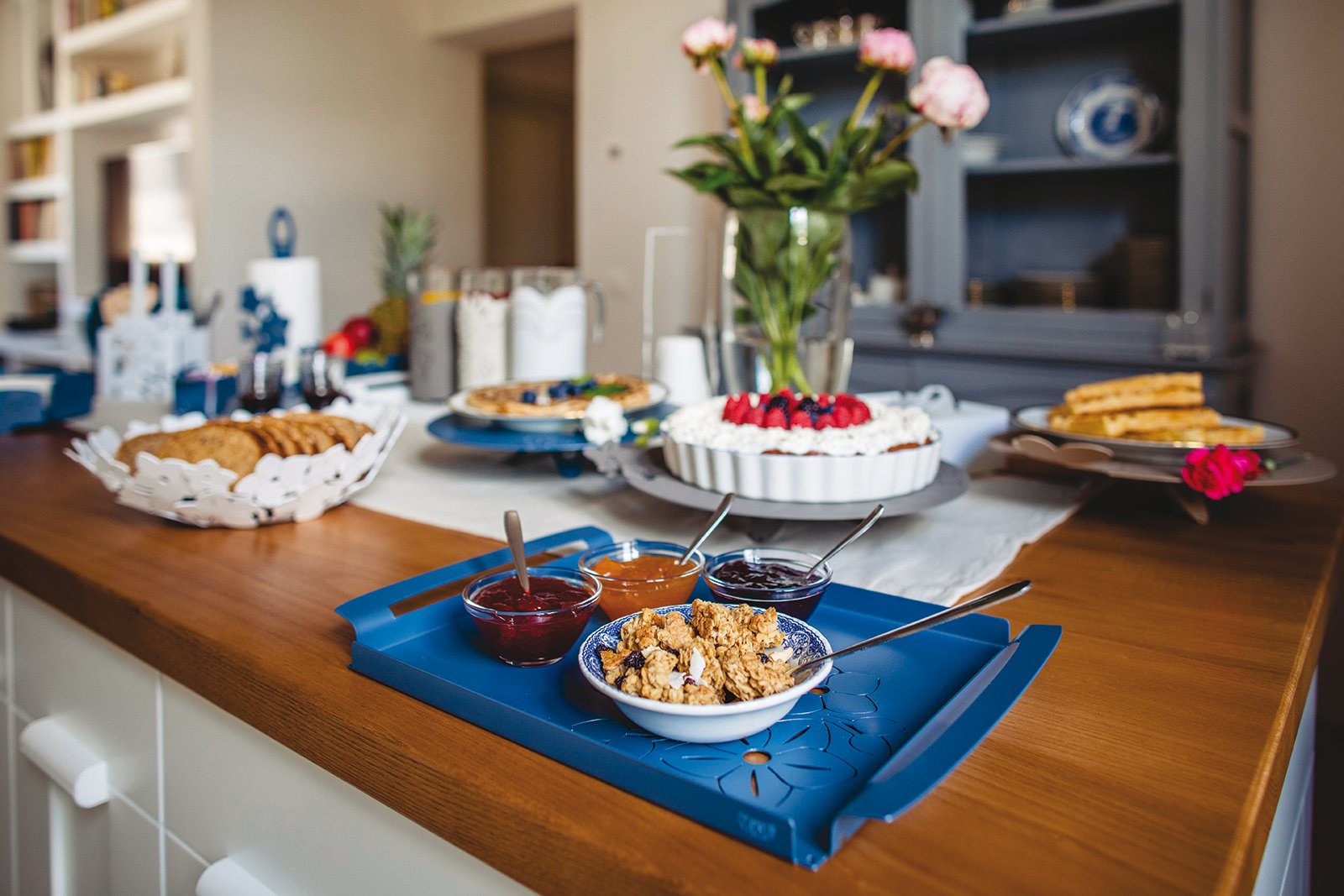 Ein kleines Tablett im Blumenstil mit Lotusblumen auf der Hauptoberfläche. Die beiden Seitengriffe erleichtern das Tragen. In drei Farben erhältlich.