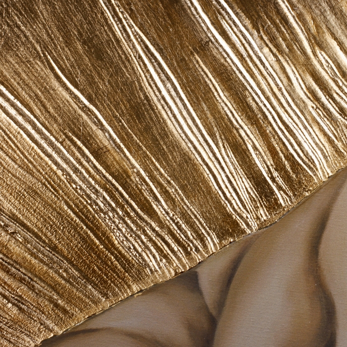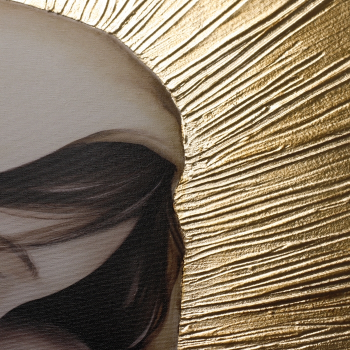 Handdekoriert mit Reliefmaterial und Blattgold auf Leinwand.