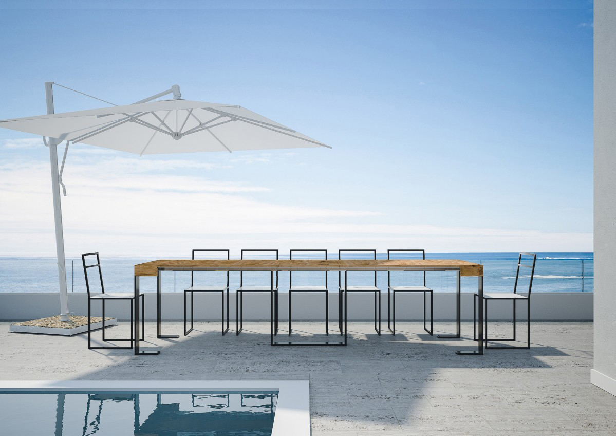Im Handumdrehen verwandelt sich Futura in einen 3 Meter langen Esstisch . Ein Mittelfuß ist nicht notwendig, da der horizontale Rahmen als Stütze dient.