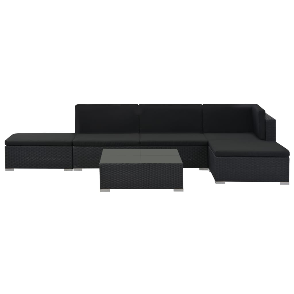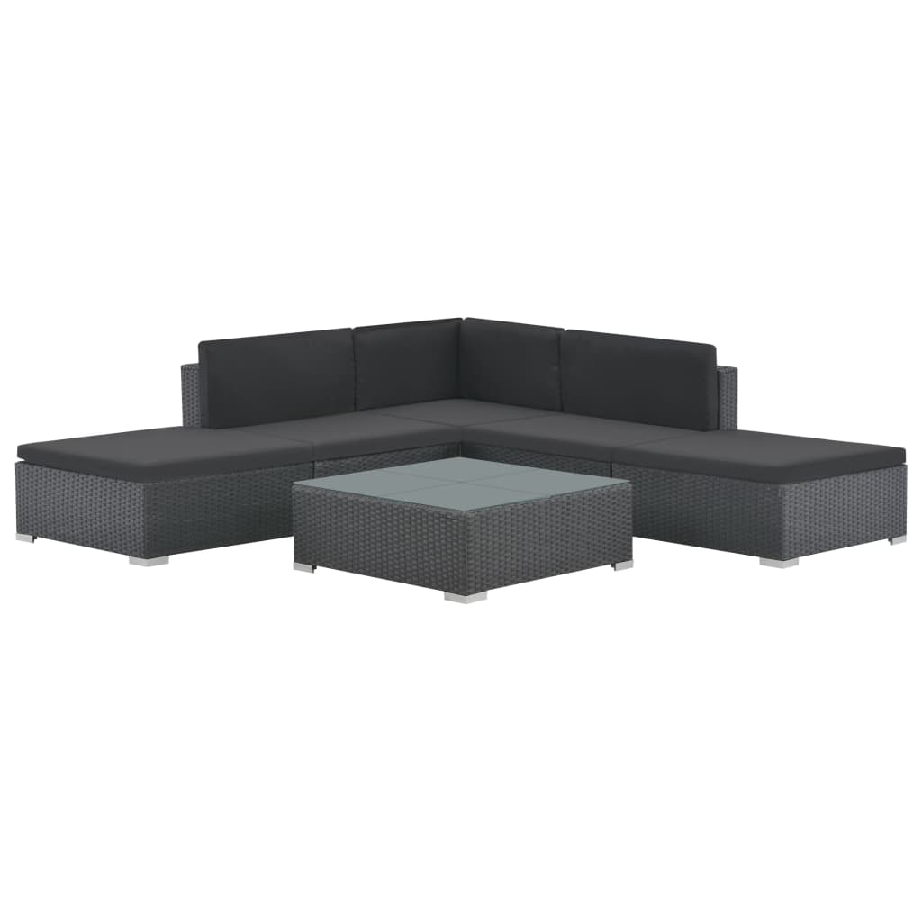 Im Lieferumfang sind 1 x Eckbank, 2 x Sitze mit Armlehnen, 2 x Hocker, 1 x Couchtisch mit Glasplatte, 5 x Sitzkissen und 4 x Rückenkissen enthalten.