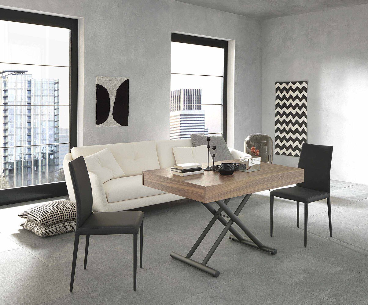 Couchtisch umwandelbar in einen Esstisch, Metallbasis, Gasmechanismus, millimetergenau höhenverstellbar von 28 cm bis 80 cm, rechteckige Platte aus Melamin, lackiert, Holz- oder Mörteleffekt.