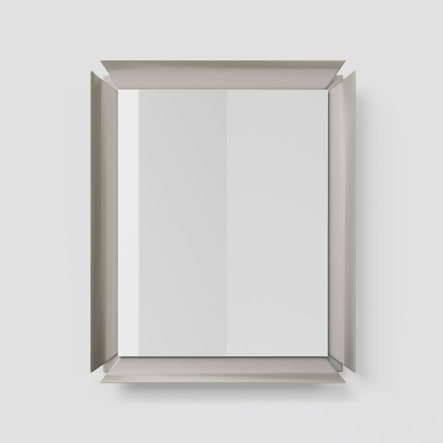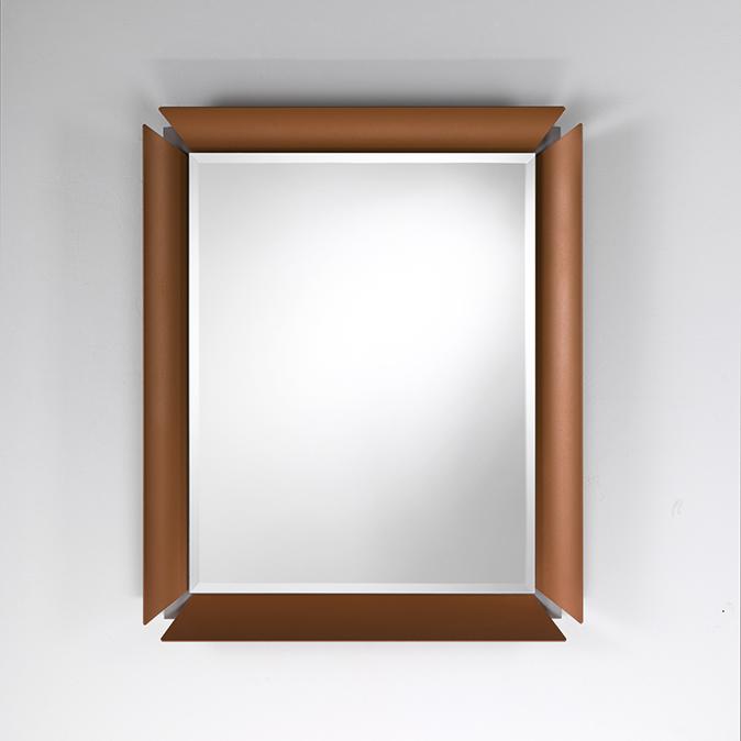 Wandspiegel mit matt lackiertem Aluminiumrahmen, befestigt an einer farbigen Laminatunterseite.