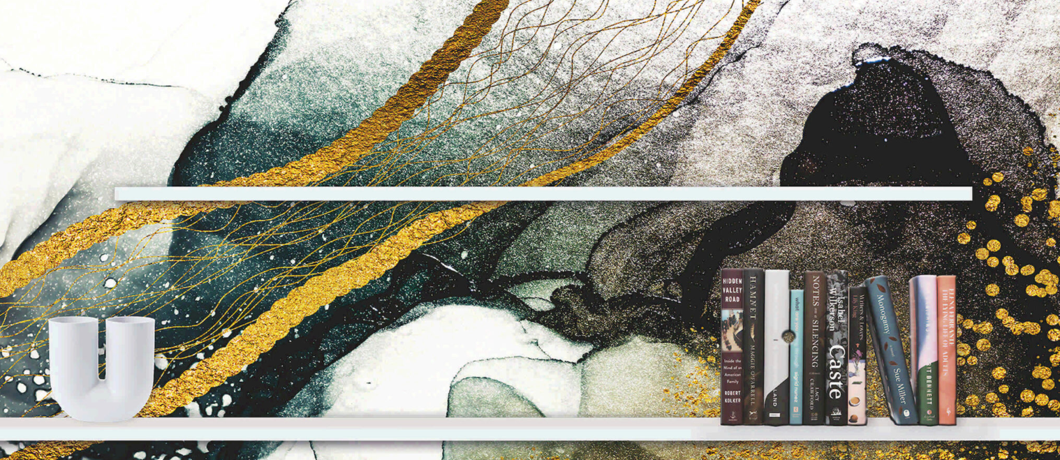 Das Gold-Bücherregal von Pintdecor ist ein elegantes Wandaccessoire mit zwei versetzten, elfenbeinweiß lackierten Regalen.