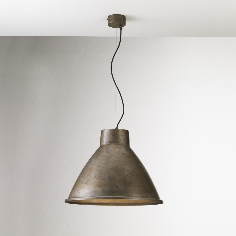 Die Loft- Kollektion besteht aus Aufhängungen, Wandleuchten, einer Tischlampe und einer Stehlampe, alle in Eisenoptik mit Messinggussverbindungen.