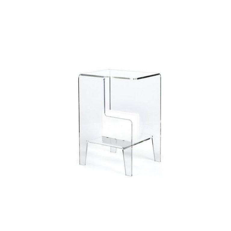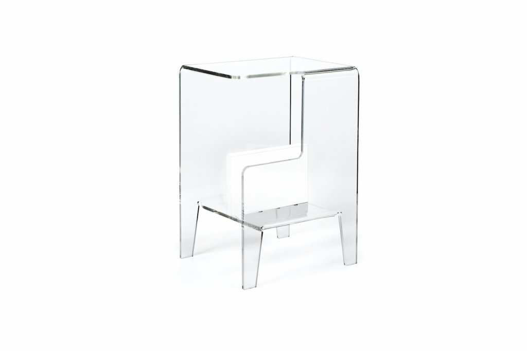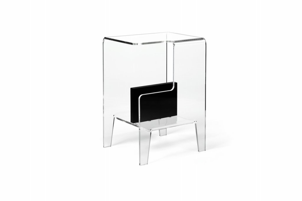 Multifunktionale Ergänzung (Couchtisch, Nachttisch, Zeitungsständer) aus transparentem Methacrylat.