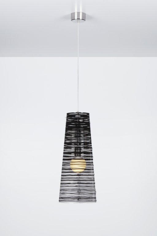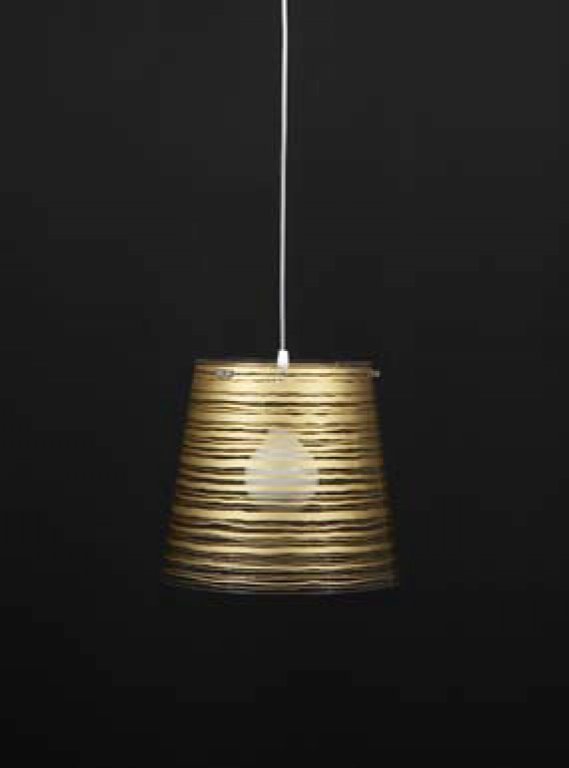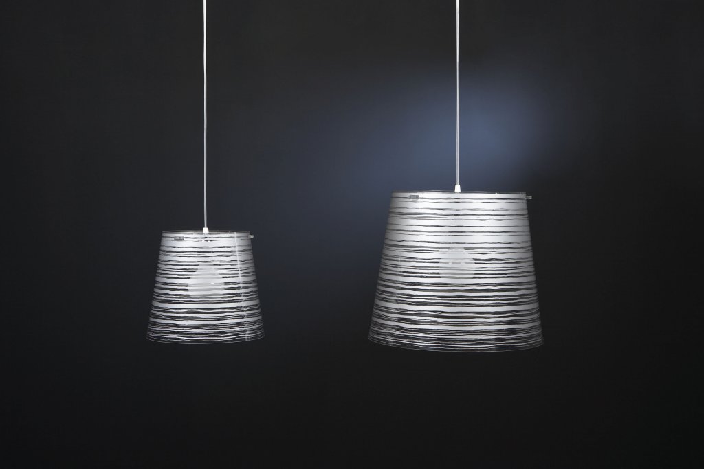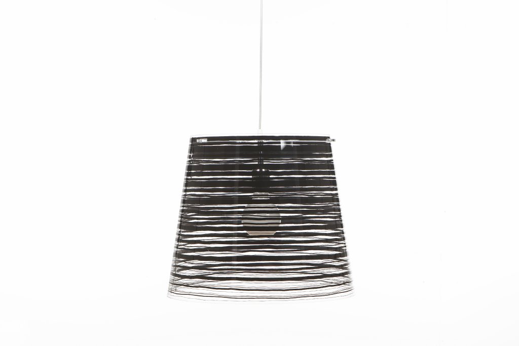 Hängelampe mit konischem Lampenschirm aus transparentem Polycarbonat und Dekoration in verschiedenen Farben, Größen und Formen.