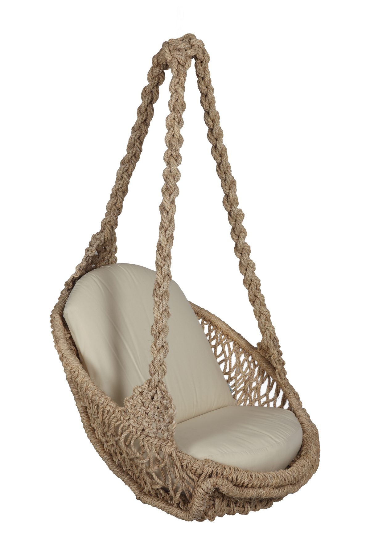 Einzelner hängender Sessel mit Kissen, handgewebte Naturfaserversion. Abmessungen: 159 x 90 cm (A2002)