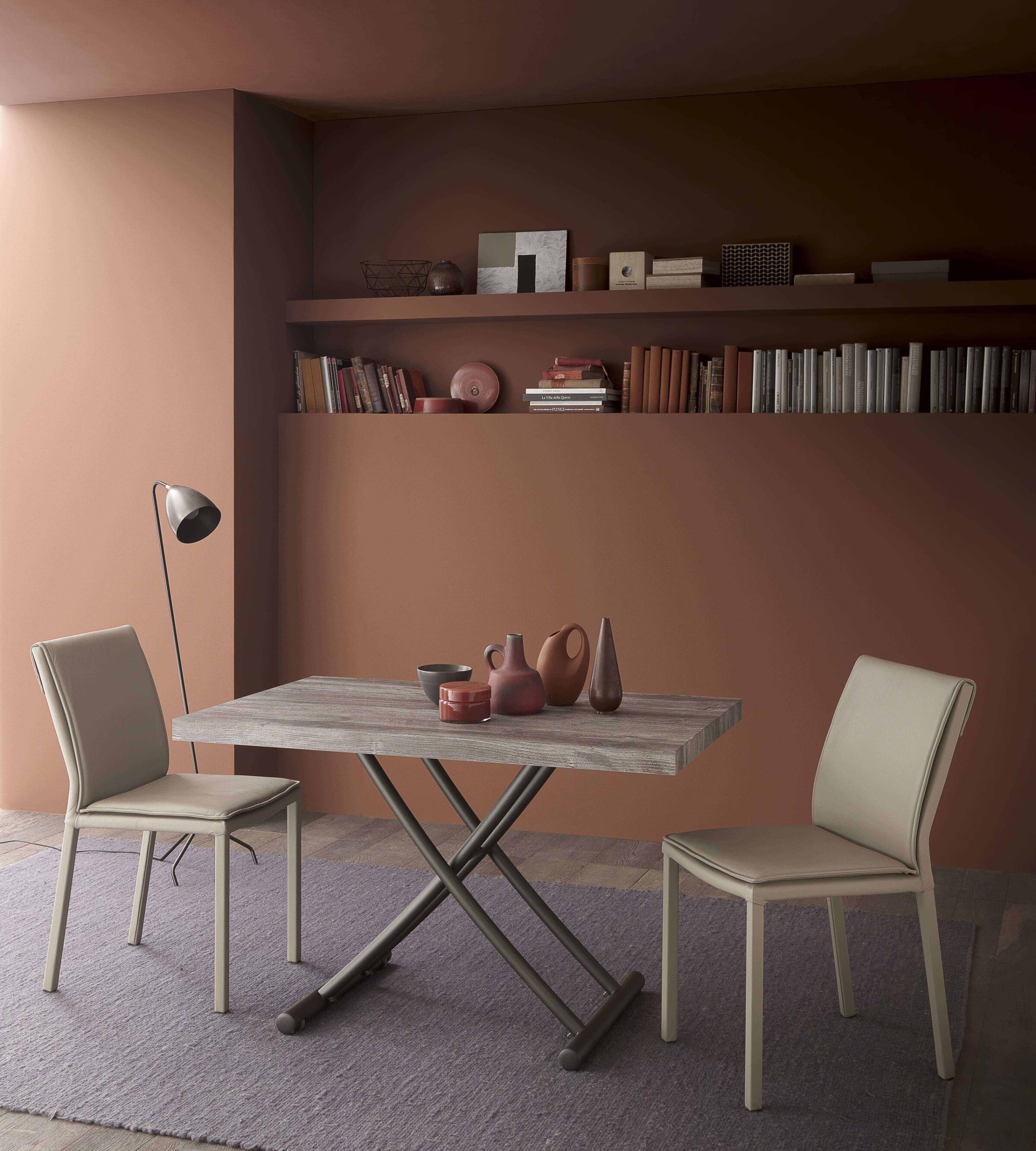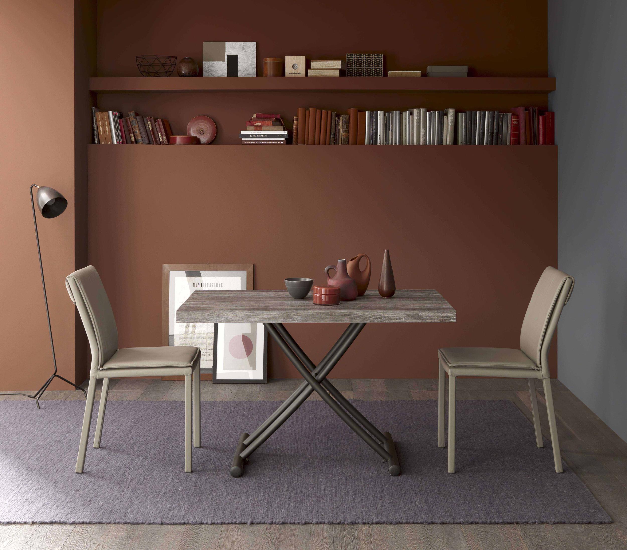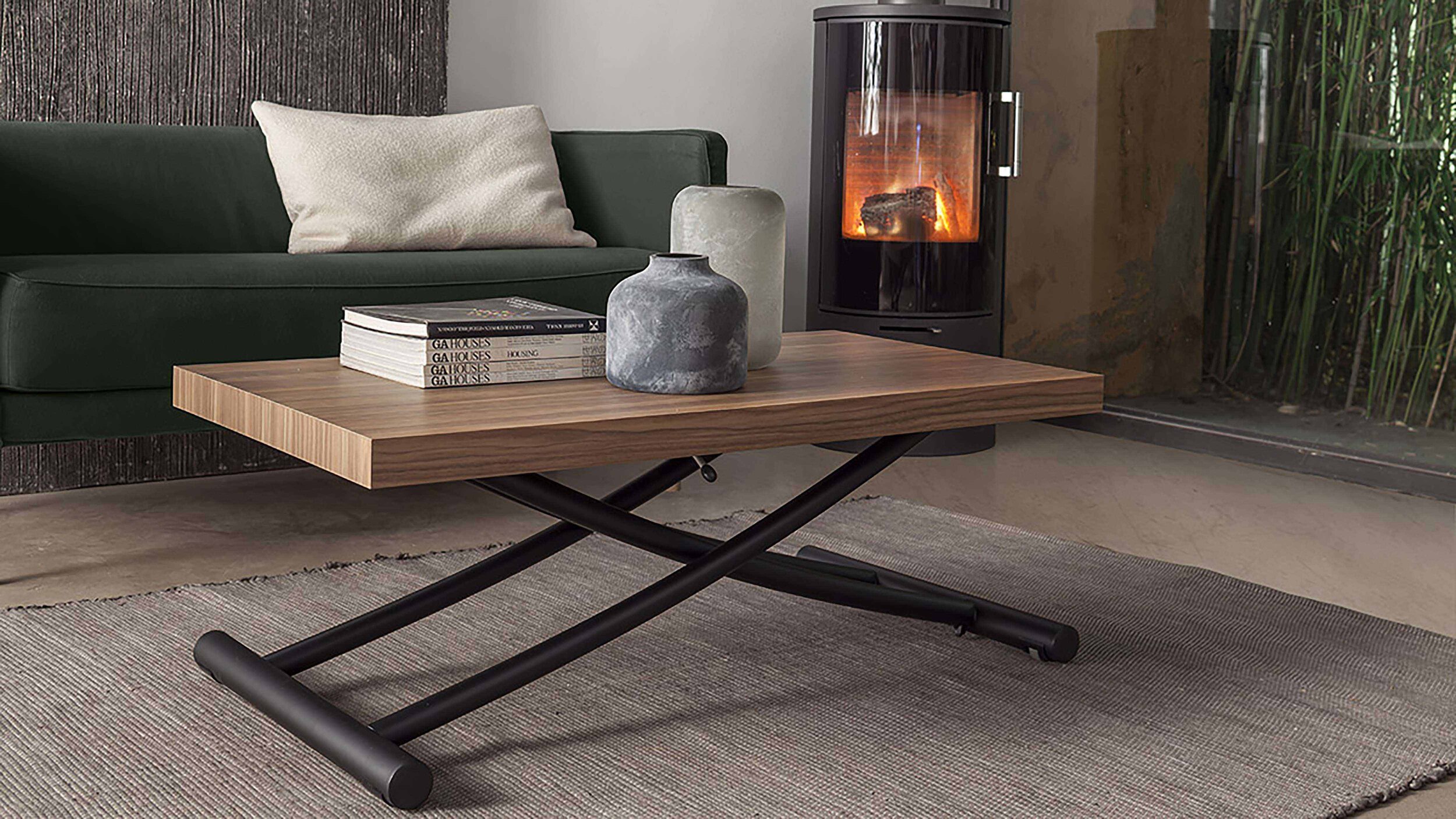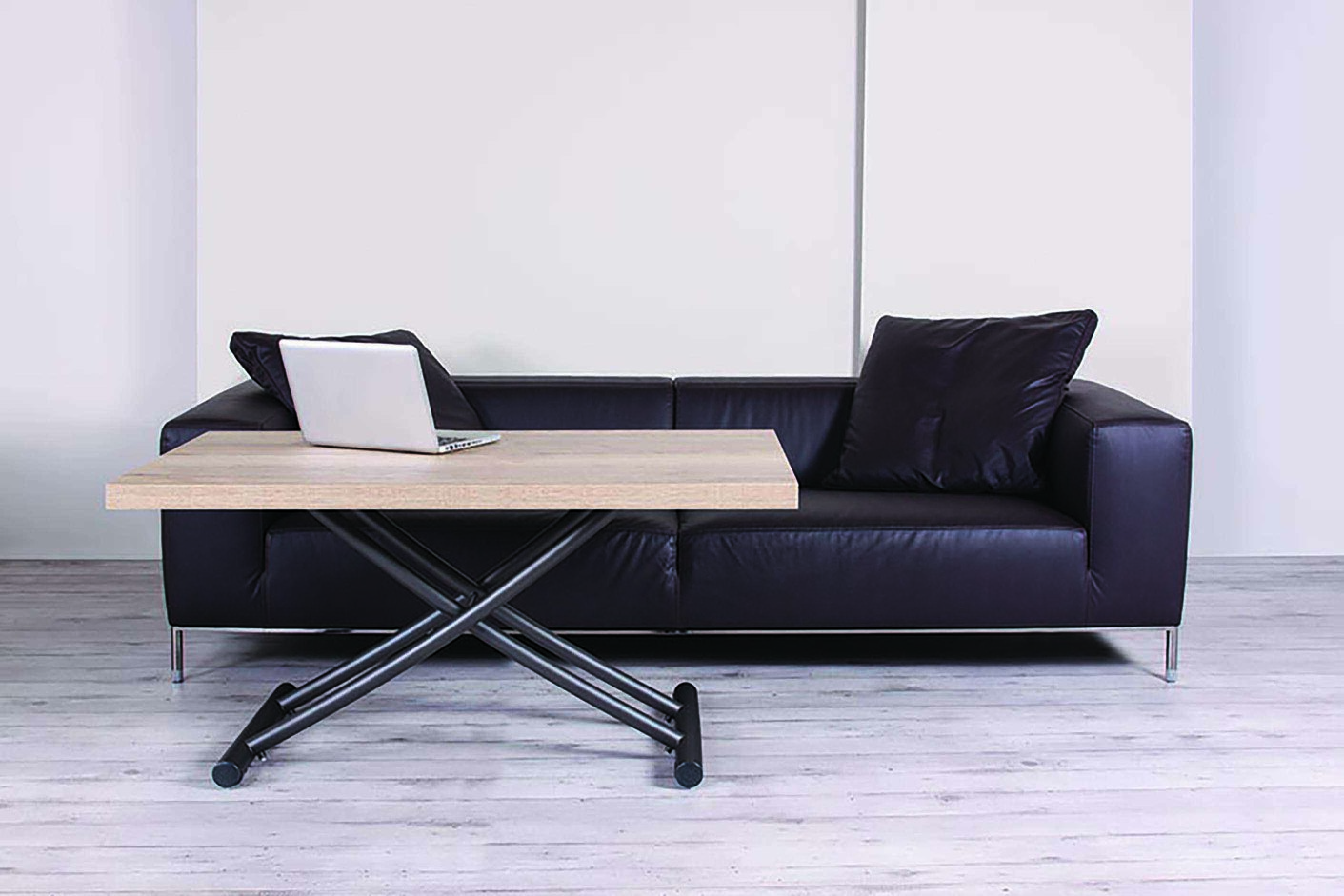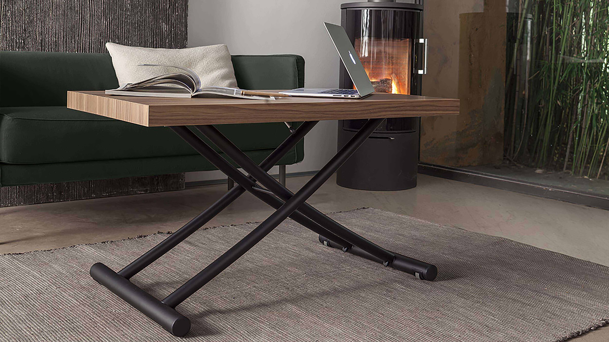 Der niedrigste verwandelbare Tisch der Welt ist Geniale , dem Namen und der Realität nach. In niedriger Position lässt er sich leicht unter einem Bett oder Sofa verschwinden, um zusätzlichen Platz im Wohnzimmer zu gewinnen, während er in hoher Position ein bequemer Ort zum Arbeiten oder Mittagessen ist.