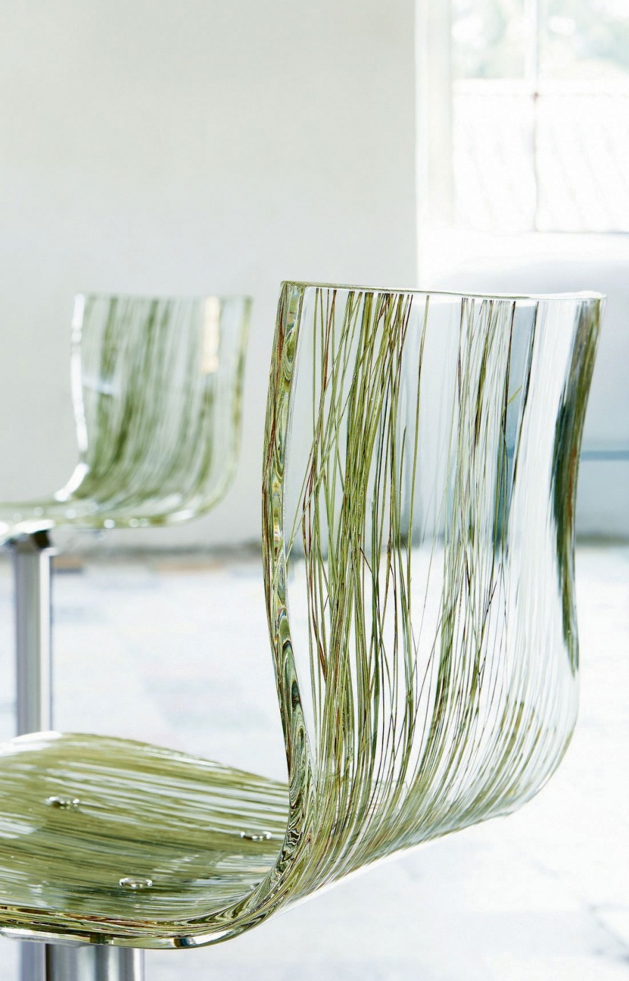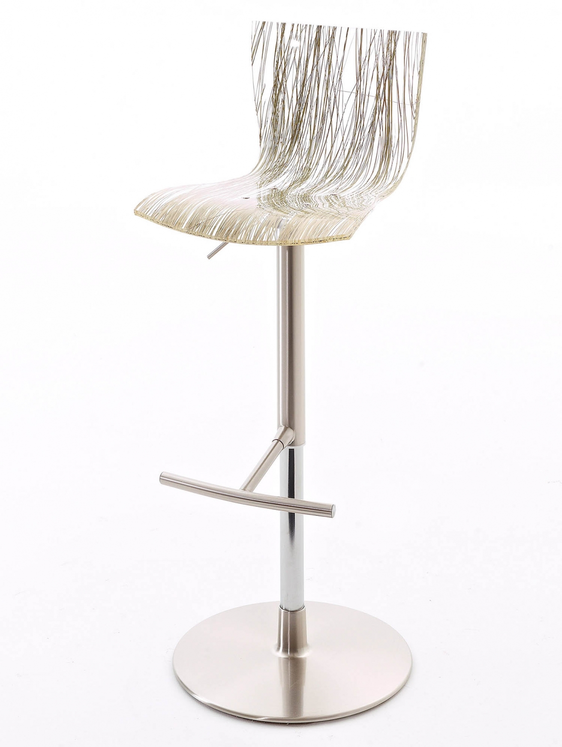 Höhenverstellbarer Hocker mit Aluminium- und Stahlkonstruktion, Stahlkolben und Methacrylat-Drehgelenk.