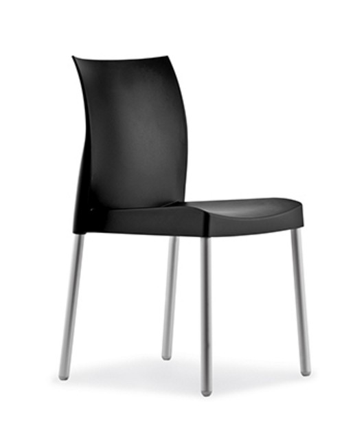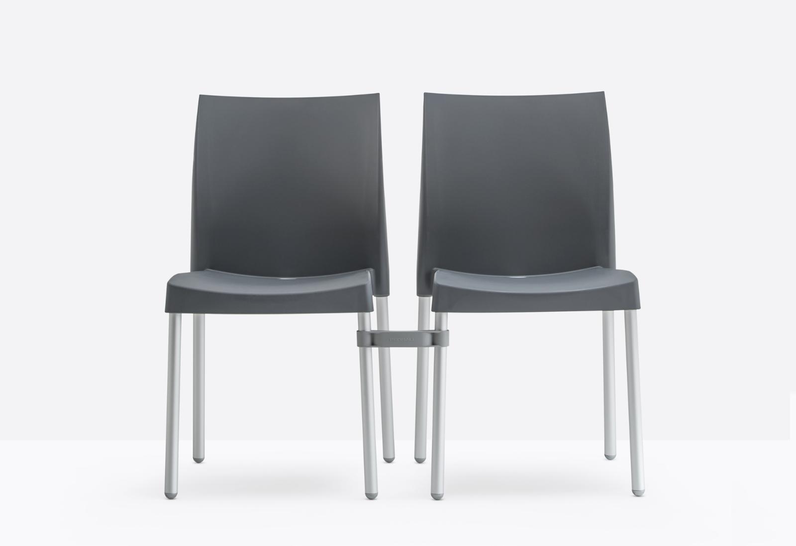 Stapelbarer Stuhl mit Polypropylenschale und Beinen aus eloxiertem Aluminiumrohr mit einem Durchmesser von 28 mm.