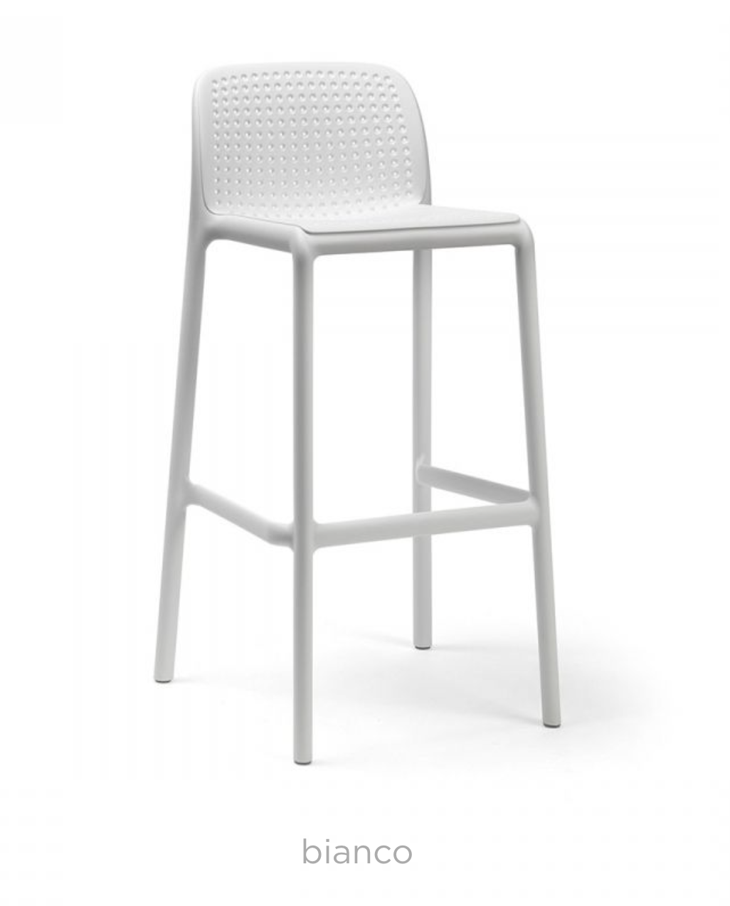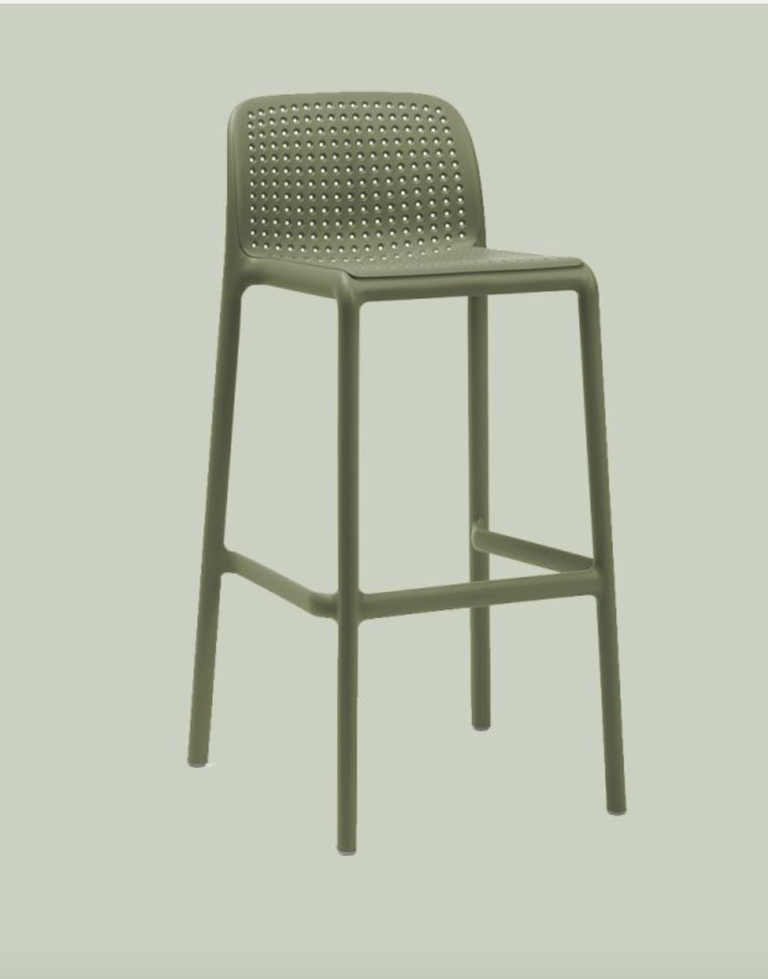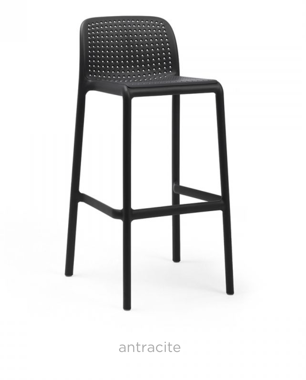 Monoblock-Hocker. Polypropylen-Glasfaser behandelt Anti-UV und in der Masse gefärbt. Mattes Finish. Ausgestattet mit rutschfesten Füßen. Sitzhöhe 76 cm. Recycelbares Harz.