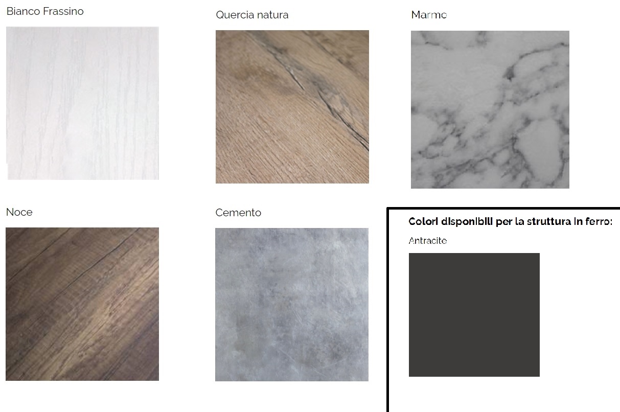 Die Tischplatte aus Mikropartikelholz ist in den folgenden Ausführungen erhältlich: Weißesche, Natureiche, Nussbaum, Beton und Marmor. Die Einlegeplatten sind auf die Oberfläche der Tischplatte abgestimmt.