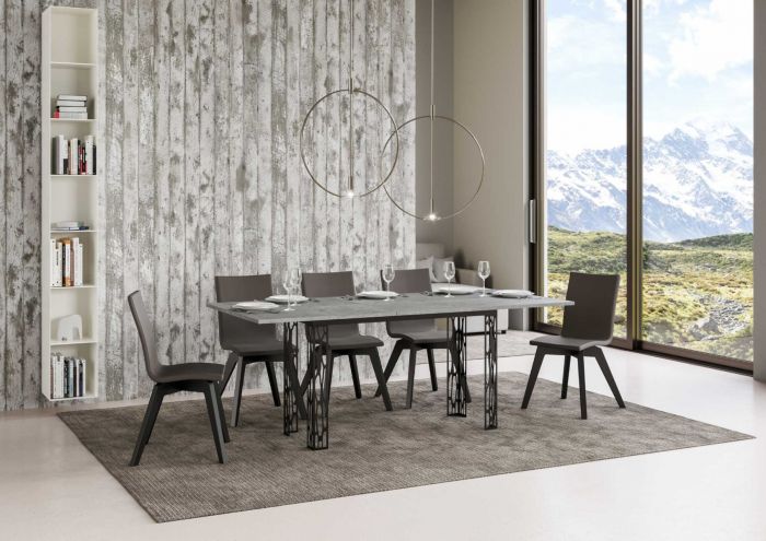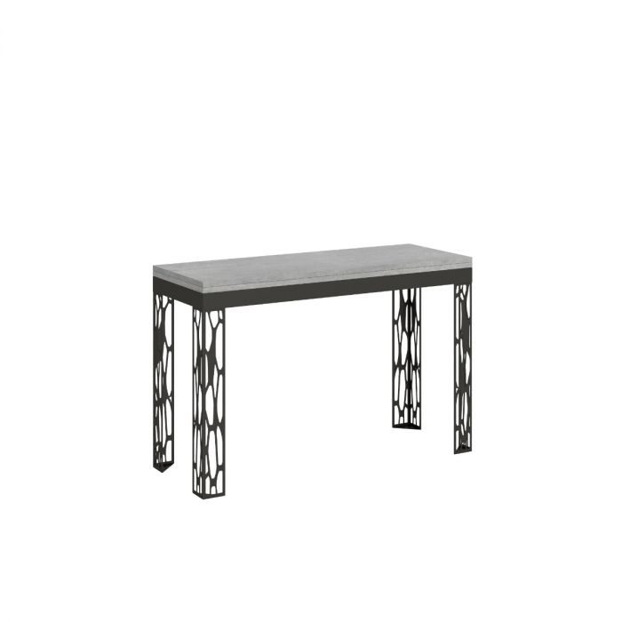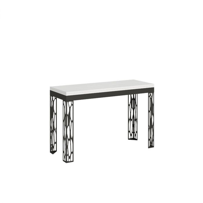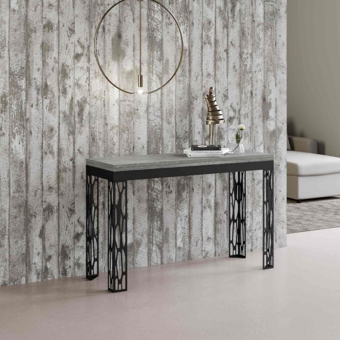 Ein Klapptisch mit Eisengestell und perforierten Beinen im modernen und originellen Stil. Dieses Modell verdoppelt seine Tischfläche mit wenigen Handgriffen. Optional ist eine Verlängerungsplatte erhältlich, die im geöffneten Zustand eingesetzt werden kann, um die Kapazität weiter zu erhöhen.