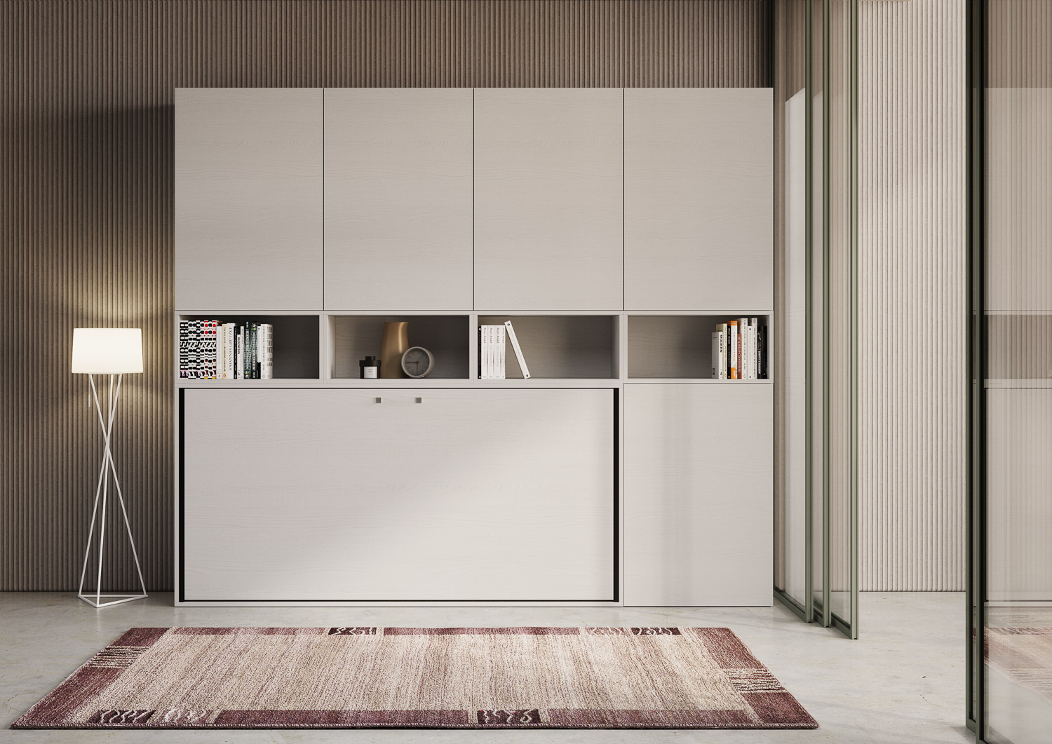 | Material | Kando C Einzelklappbett vorgeschlagen in Kombination mit einem Set von Wandmodulen (fünf mit Tür und internem Regal und vier mit offenem Fach). Eine originelle und funktionale Lösung, die es ermöglicht, den verfügbaren Raum zu optimieren. Wenn es geöffnet |