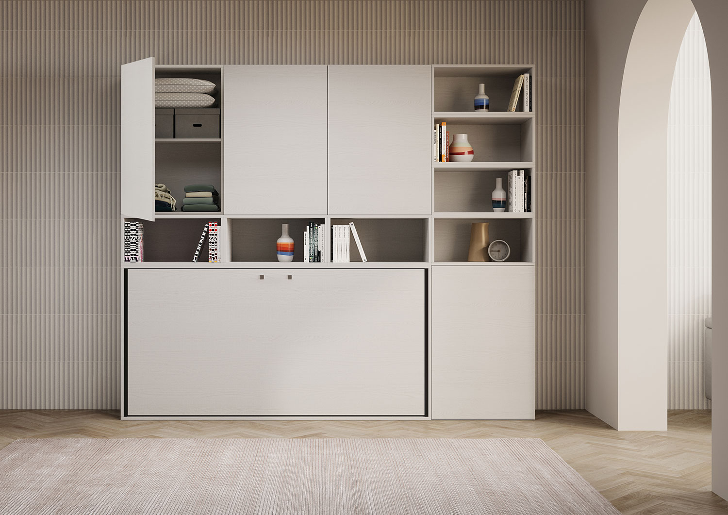 | Material | Kando E Einzelklappbett vorgeschlagen in Kombination mit einem Set von Wandmodulen (vier mit Tür und internem Regal und sieben mit offenem Fach). Eine originelle und funktionale Lösung, die es ermöglicht, den verfügbaren Raum zu optimieren. Wenn es geöffn |