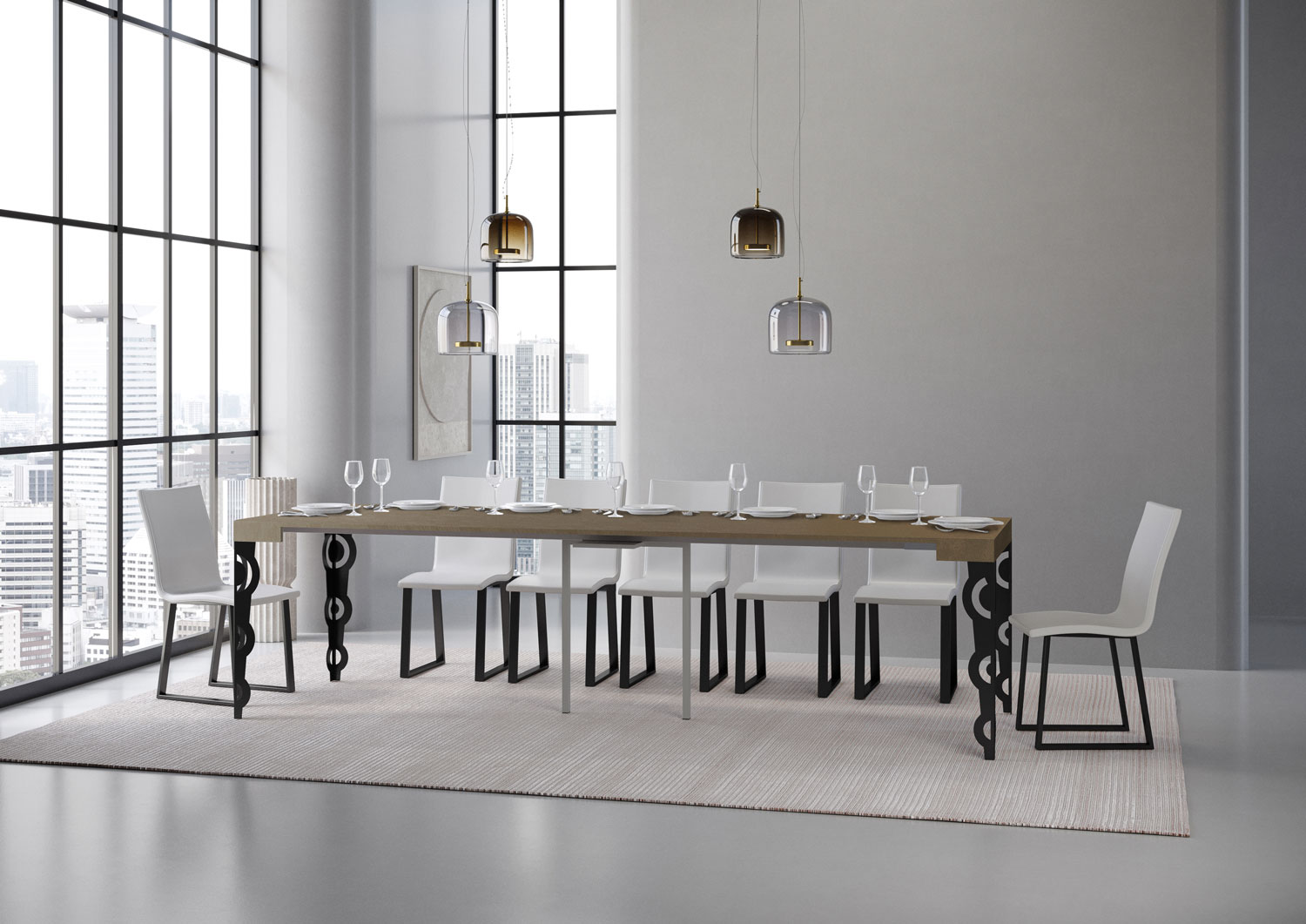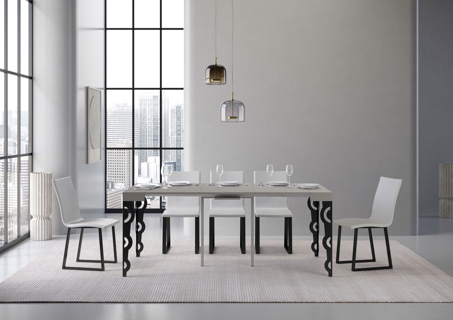 Ausziehbarer Konsolentisch Karamay, vielseitig und robust, ein perfektes Möbelstück für jeden Raum im Haus: Eingangshalle, Küche, Esszimmer, Wohnzimmer oder Flur. Der ausziehbare Konsolentisch Karamay lässt sich leicht in einen großen Esstisch mit einer Länge von bis zu 300 cm verwandeln, an dem bis zu 14 Personen Platz finden. Mit melaminbeschichteten Spanplatten und Eisenbeinen hergestellt. Das Auszugssystem mit Aluminium-Teleskopschienen und die zentrale Unterstütze machen den Konsolentisch stabil und robust. Im geschlossenen Zustand müssen die Verlängerungen irgendwo anders im Haus verstaut werden. Itamoby Produkt Made in Italy Produkt Maße: Im geschlossenen Zustand: B.90 T.40 H.77 cm Mit 1 Verlängerung im Einsatz: 92 cm Mit 2 Verlängerungen im Einsatz: 144 cm Mit 3 Verlängerungen im Einsatz: 196 cm Mit 4 Verlängerungen im Einsatz: 248 cm Mit 5 Verlängerungen im Einsatz: 300 cm