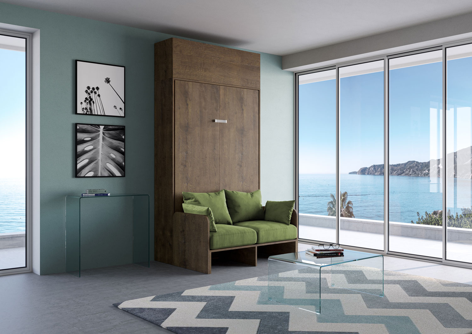 Material Schrankbett Kentaro mit Sofa 140 in französischer Ausführung erhältlich, mit Wandschrank. Komplette Komposition für einen Design-Wohnbereich, der sich mit wenigen Handgriffen in einen komfortablen Schlafbereich verwandeln lässt. Die Zusammensetzung wird m