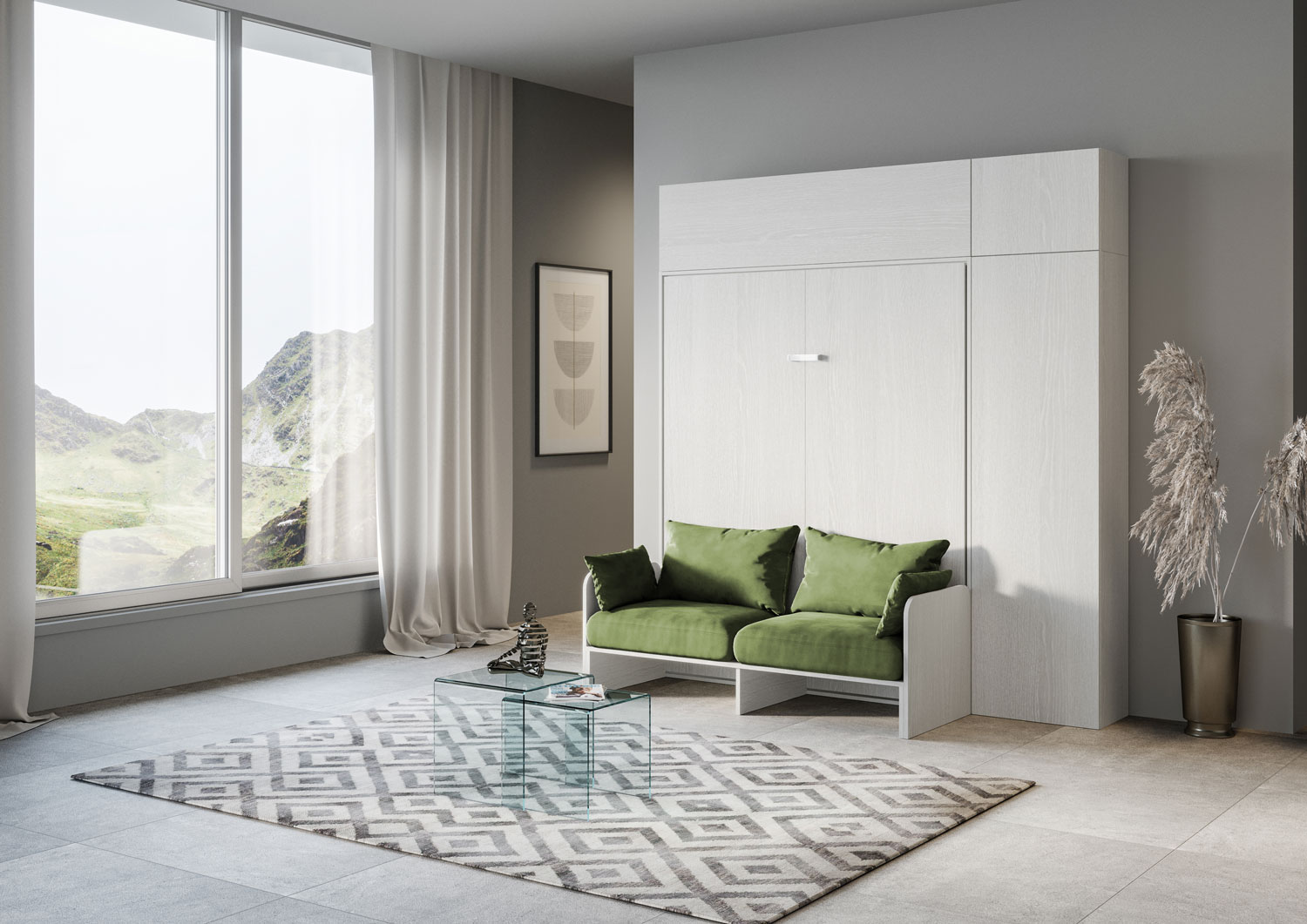 | Material | Klappbares Schrankbett Kentaro mit Sofa 160, vorgeschlagen in der Version mit Sofa, einem Säulenschrank und zwei Wandschränken aus der Isoka-Linie. Das Mikrofasersofa ist Alessia 20 (wie abgebildet). Eine vielseitige, intelligente und multifunktionale Kom |