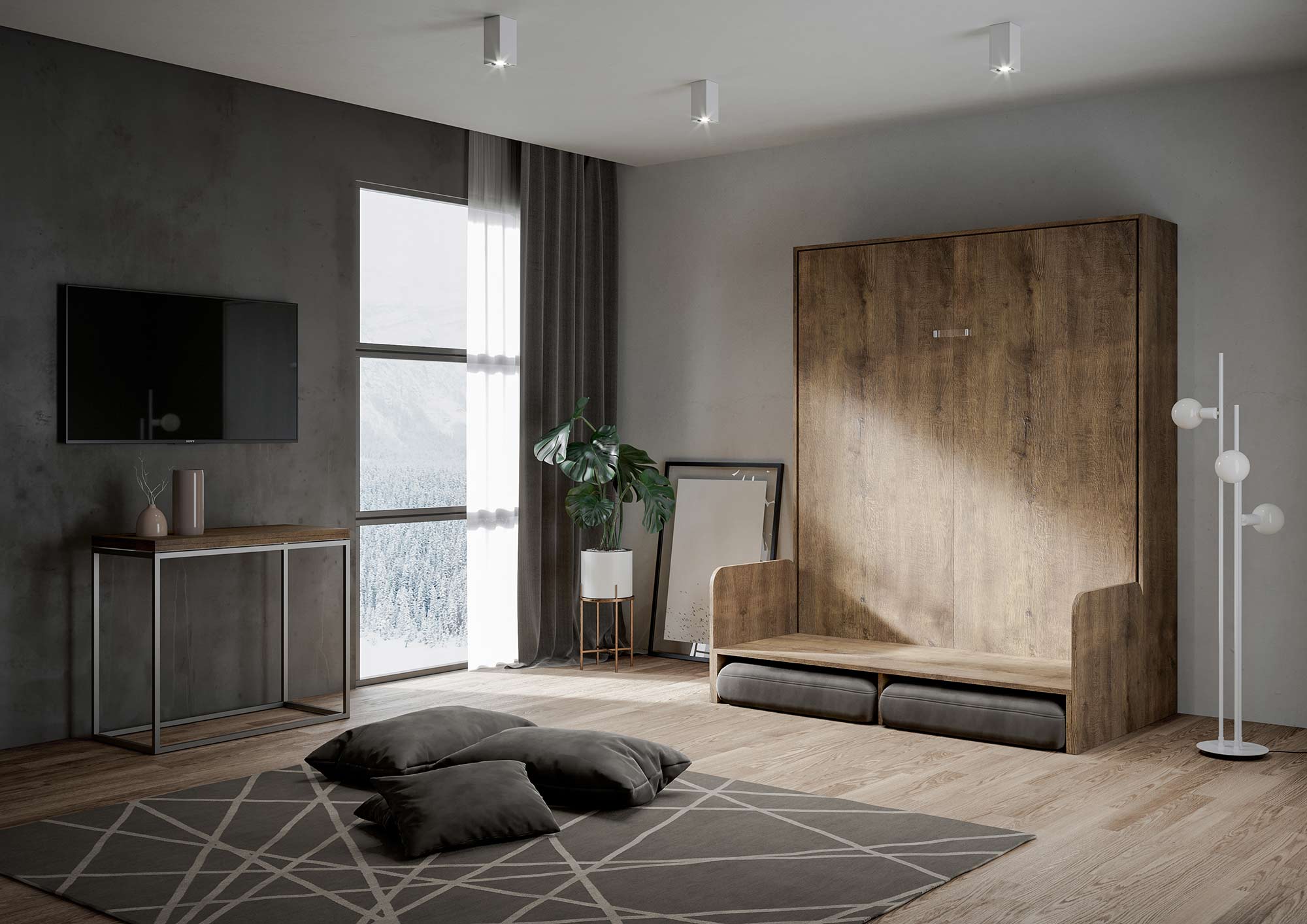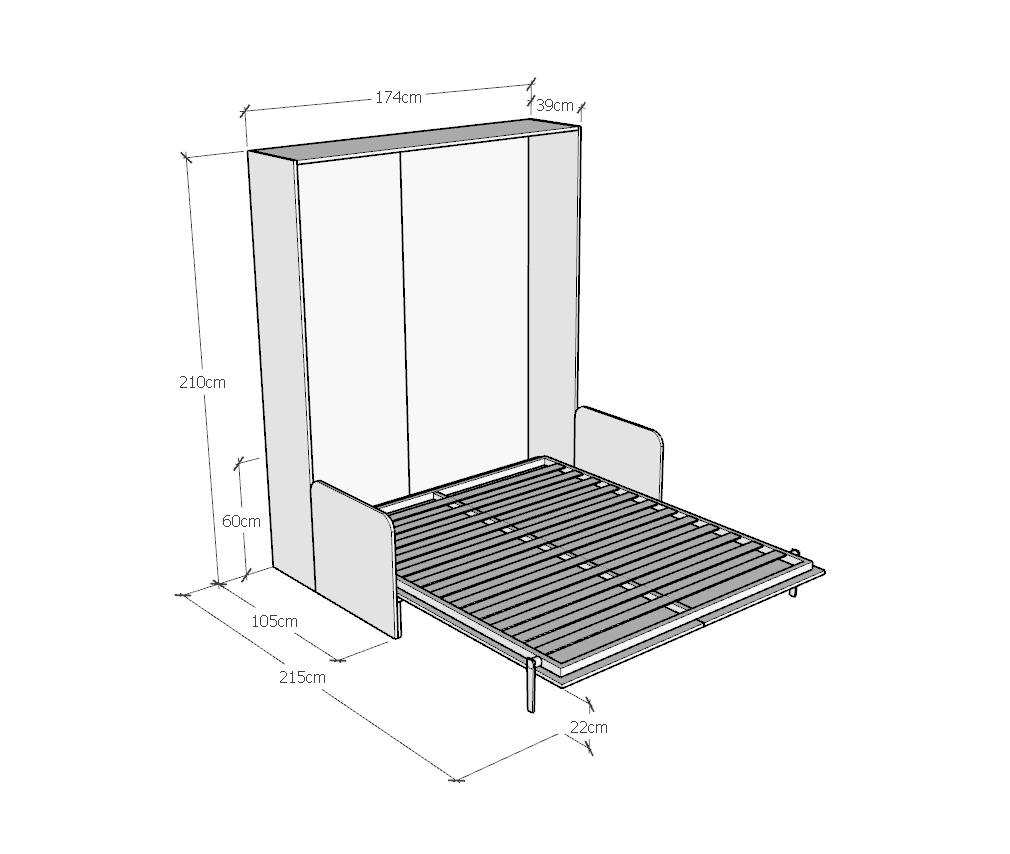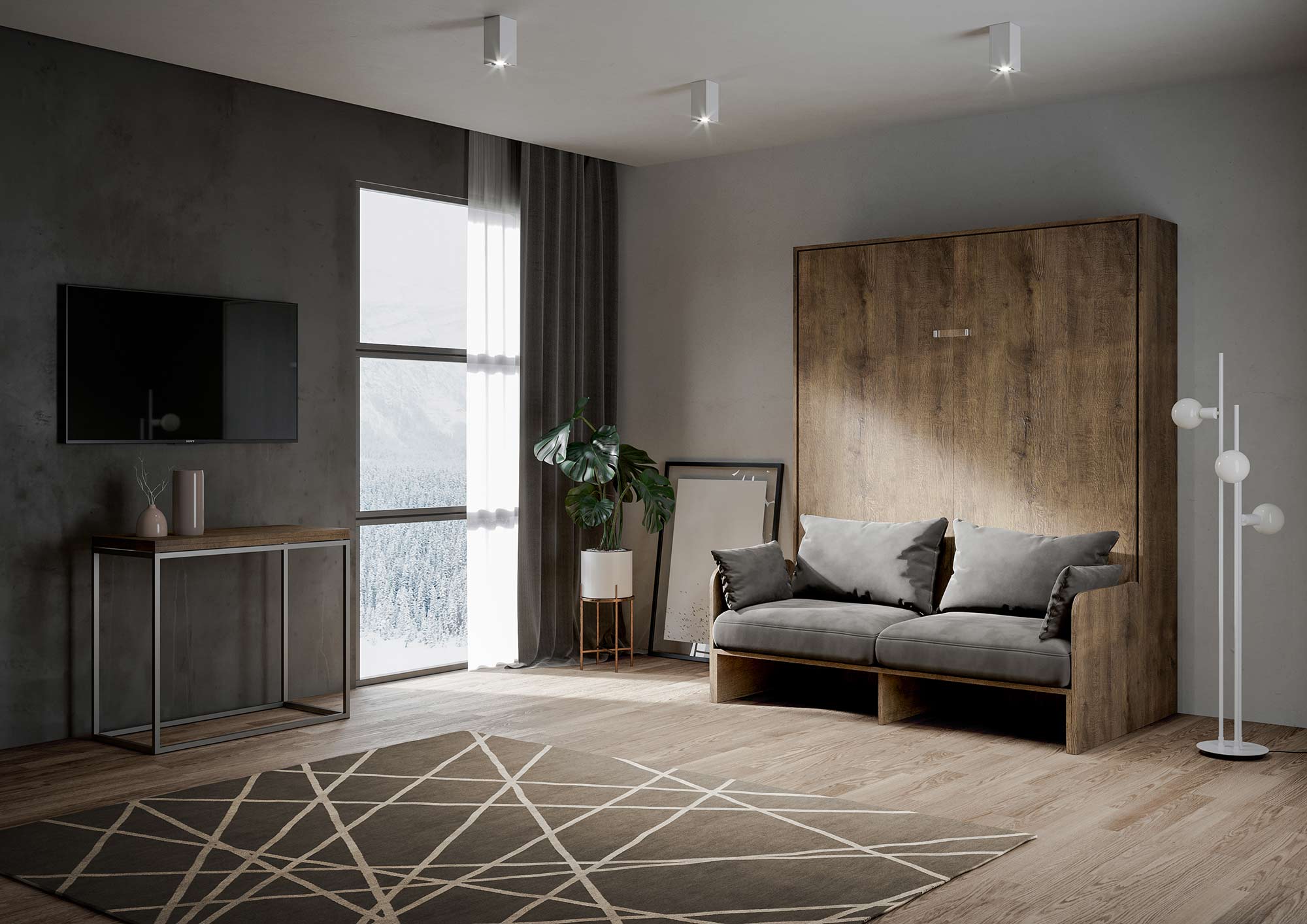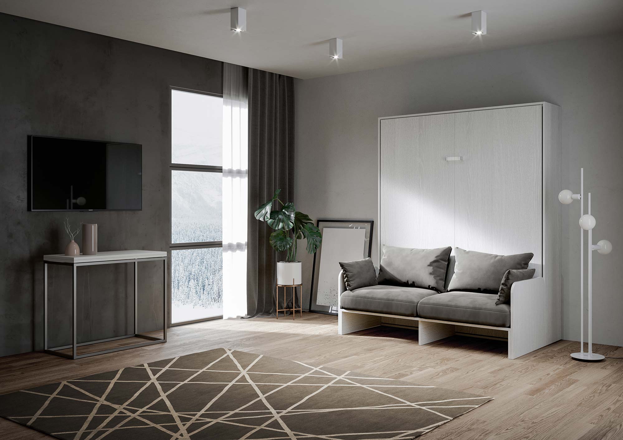 Das Doppelwandbett Kentaro Sofà 160 ist eine originelle Idee, die dank eines zusätzlichen Sofas den Wohnbereich mit wenigen Handgriffen in einen Schlafbereich verwandelt. Die perfekte Lösung für Studios und kleine Räume, in denen jeder Quadratmeter zählt: Dieses clevere Modell ermöglicht es Ihnen, Ihren Platz optimal zu nutzen, ohne auf Komfort, Bequemlichkeit und Design verzichten zu müssen. Die Sofakissen sind vollständig abnehmbar und bestehen aus Mikrofaser. Die Polsterfarbe kann aus den in der Bildergalerie verfügbaren Farben ausgewählt werden. Der Rahmen von Bett und Sofa besteht aus 18 mm starker melaminharzbeschichteter Spanplatte. Das Untergestell besteht aus verstärktem Eisen und ist mit Epoxidpulver in geprägtem Aluminium lackiert. Inklusive eines 163 x 190 cm großen Buchenlattenrosts mit Matratzengurten. Das Bett wird mit Gasdruckfedern abgesenkt und verfügt über einen Griff. Matratze nicht im Lieferumfang enthalten. Empfohlene Matratzenmaße: L. 160 B. 190 H. 22 cm. Maximale Bettbelastung: 240 kg. Bitte beachten: Das Kentaro Sofà Wandbett wird zerlegt geliefert. Die Montage ist sehr schwierig und erfordert zwei erfahrene Personen. Eine Wandmontage ist zwingend erforderlich. Maße: Geschlossenes Bett: L.173,6 T.105,2 H.210,5 cm. Offenes Bett: L.173,6 T.215 H.210,5 cm. Höhe des Untergestells vom Boden: 22 cm. Maximale Matratzenhöhe: 24 cm. Hergestellt in Italien. Produkt von Itamoby.