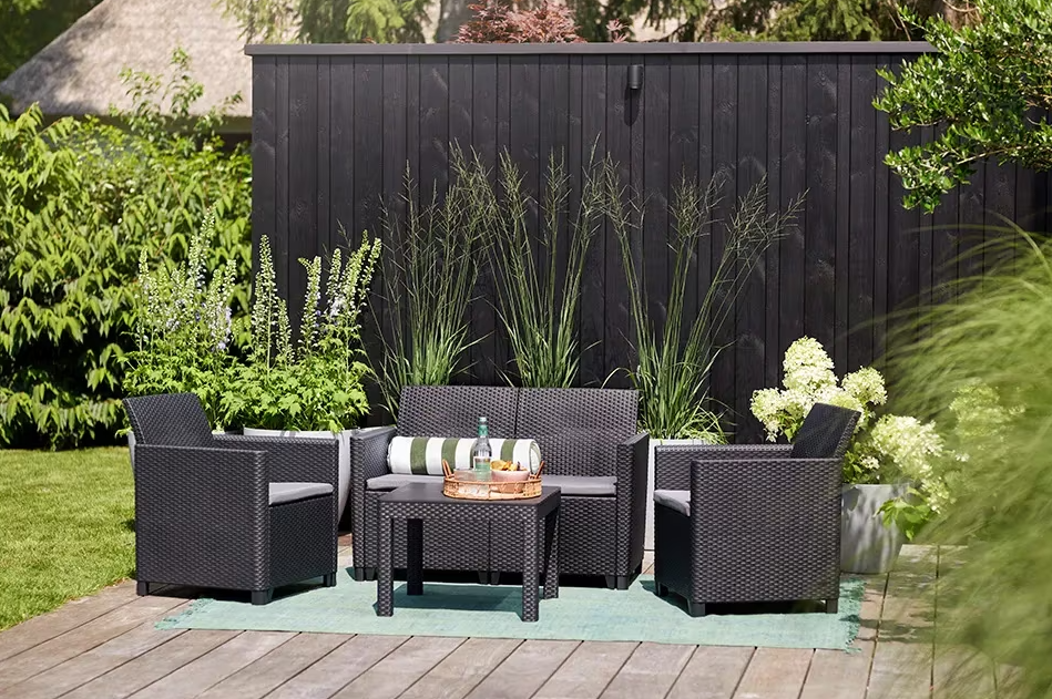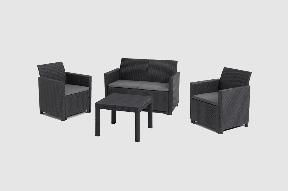 Das Marie-Set von Keter ist ein Garten-Lounge-Set, bestehend aus einem Sofa, Sesseln und einem Couchtisch mit einem aus hochbeständigem Harz geflochtenen Finish in Rattan-Optik.
