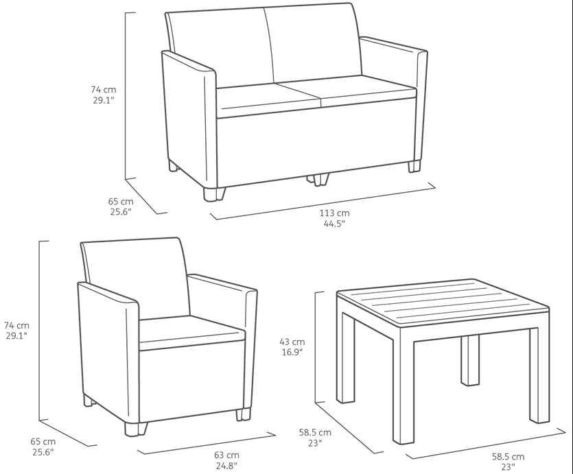 Die ungefähren Maße sind: Sofa 113x65x74 cm, Sessel 63x65x74 cm, Couchtisch 58,5x58,5x43 cm.