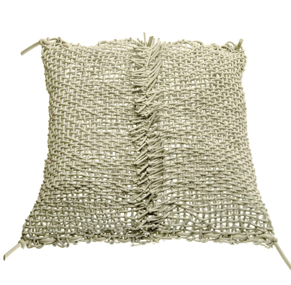 Das Fringes-Kissen entsteht durch ein handwerkliches Verfahren auf dem Webstuhl mit 4 mm Neoprenfaden, was ihm ein dynamisches Aussehen und eine unverwechselbare Materialstruktur verleiht.