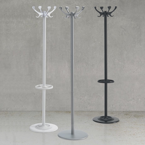 Garderobenständer aus tiefgezogenem Stahlsockel mit abgerundeten Kanten, um Beschädigungen der Bodenoberfläche zu vermeiden, mit Puder lackiert
