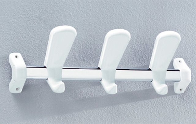 Wandgarderobe mit sechs Plätzen (3 Knöpfe und 3 Haken), bestehend aus einer Stützstange aus verchromtem Stahl mit ovalem Querschnitt 15 x 30 mm, ausgestattet mit drei Aufhängerelementen