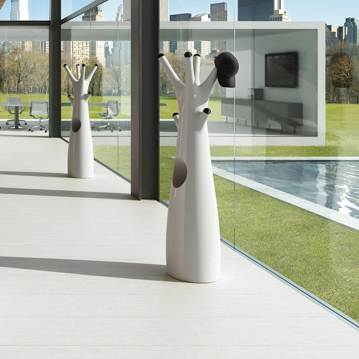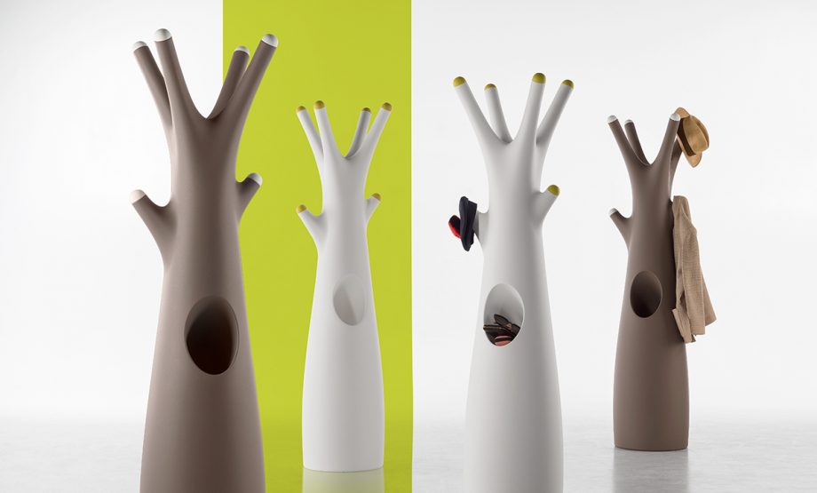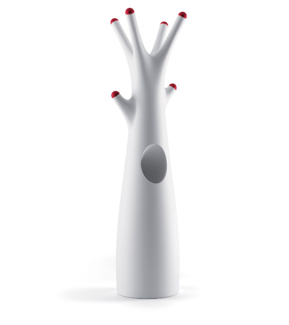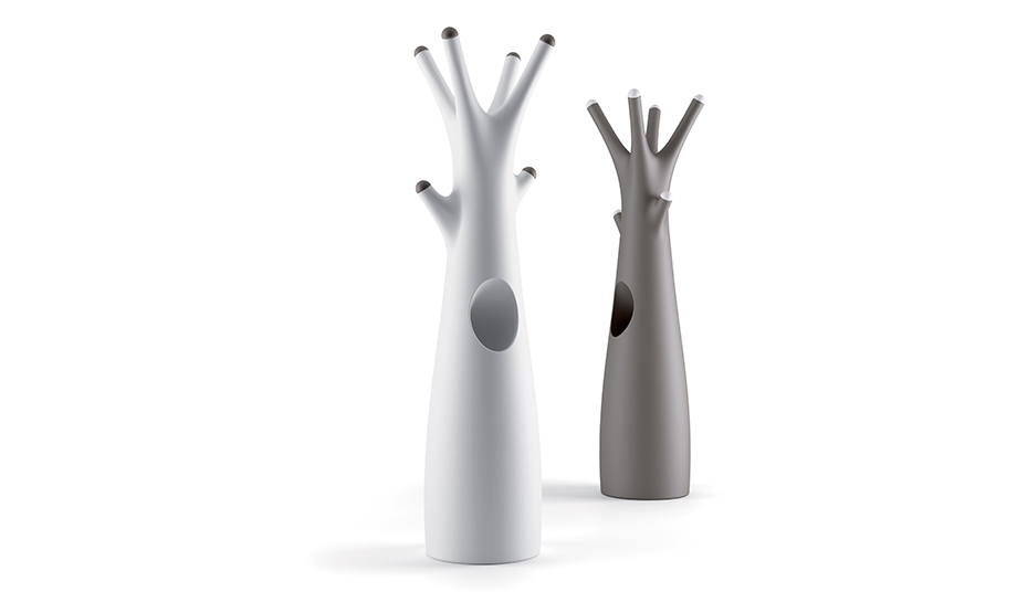 Hergestellt aus rotationsgeformtem Polyethylen , ist es widerstandsfähig, leicht und auch für überdachte Außenbereiche geeignet. Die vertikale Struktur, inspiriert von einem modernen Totem , ist mit drei perfekt in die Form integrierten Kleiderbügeln ausgestattet, was das Objekt praktisch und diskret macht.