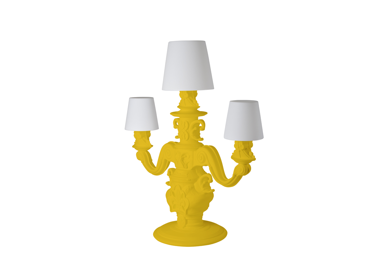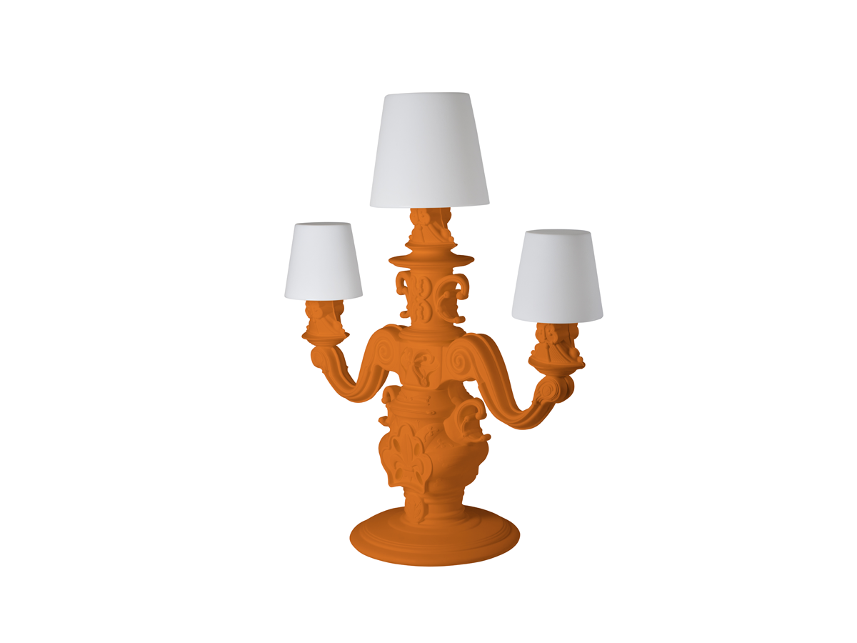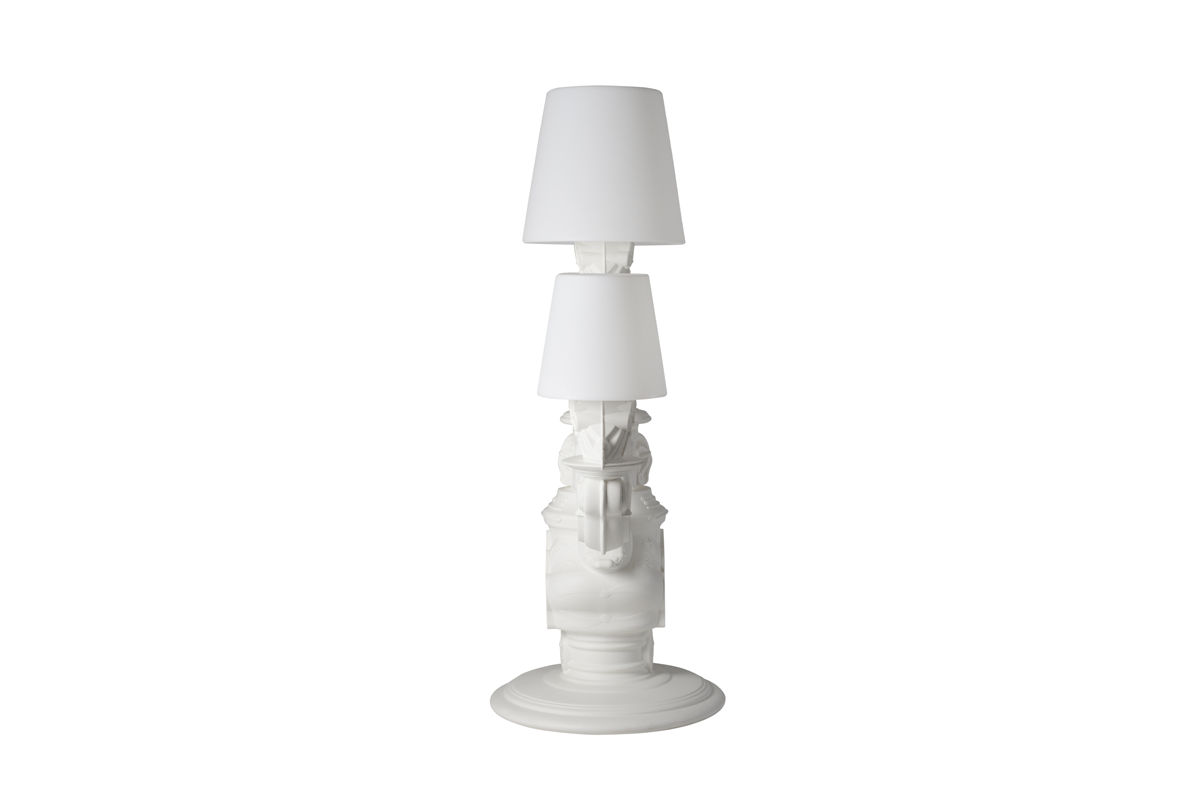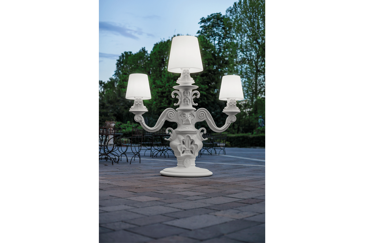 Die Stehlampe King of Love wurde von Graziano Moro und Renato Pigatti aus der Design of Love-Kollektion entworfen. Der Sockel der Lampe ist im Barockstil gehalten, während die drei großen hellweißen Lampenschirme eine majestätische Dimension haben, bieten sie eine innovative Besonderheit: Das Polyethylen wird mit einer bestimmten Oberflächenbeschaffenheit mit einer Textur klassischer Motive gearbeitet, um eine raffinierte Dekoration zu erhalten , elegant und angenehm anzufassen.