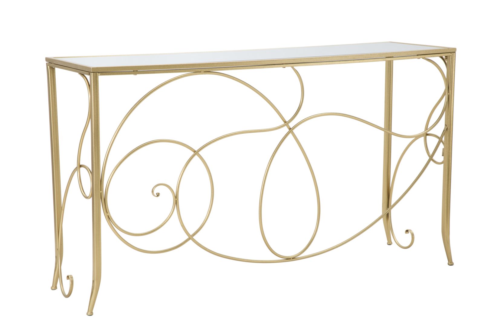 Rechteckige Konsole aus vergoldetem Metall und verspiegelter Glasplatte mit weichen und geschwungenen Linien. Das goldfarbene Metall verleiht jeder glamourösen Umgebung einen Hauch von Klasse. Die geometrischen und abgerundeten Linien passen perfekt zu jeder Art von Möbeln.