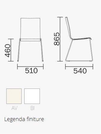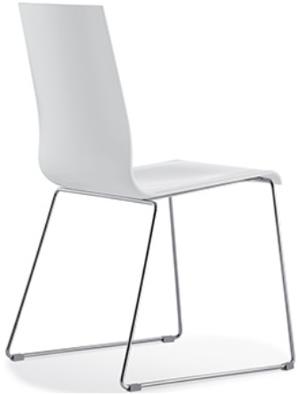 Stapelbarer Stuhl mit weißer oder elfenbeinfarbener Technopolymerschale. Die Schlittenstruktur besteht aus verchromtem Stahlstab Ø 10mm.