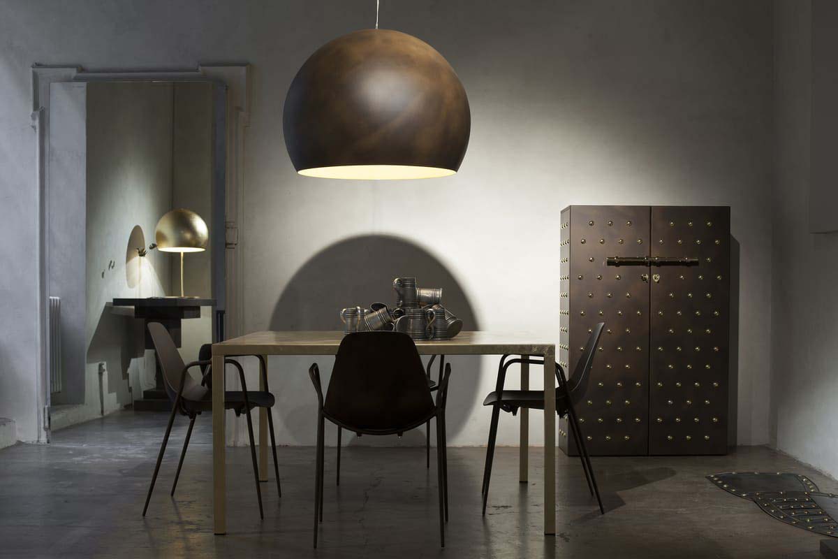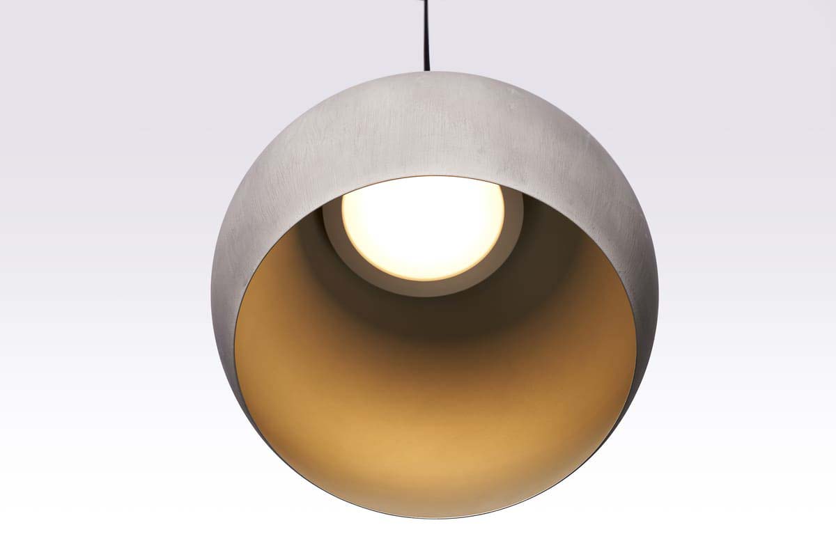 Kugelförmige Aluminiumleuchte, vier Größen, vier verschiedene Anwendungen: Aufhängung, Boden, Tisch, Wand.