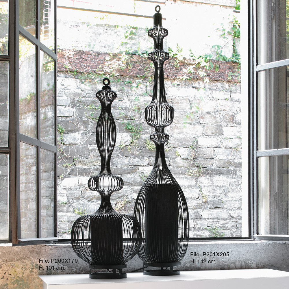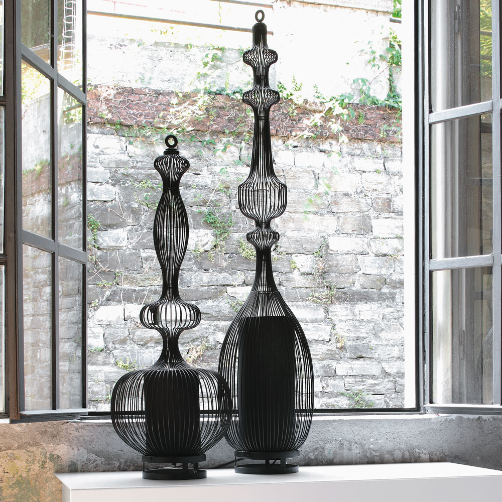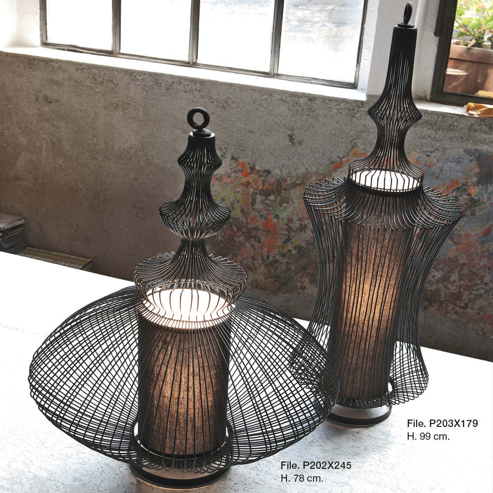Tischlampe, Struktur aus schwarz lackiertem Metalldraht.