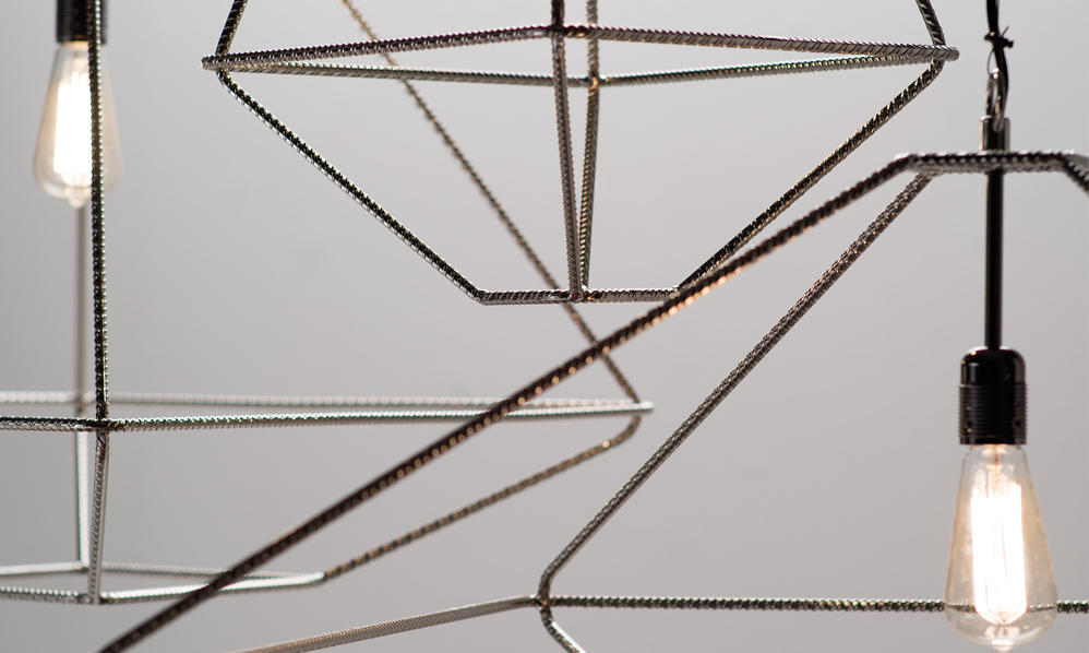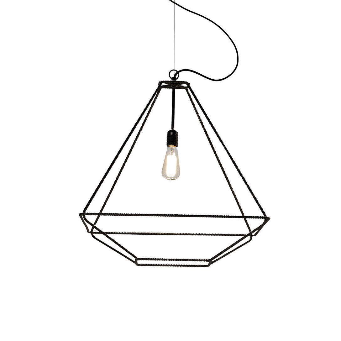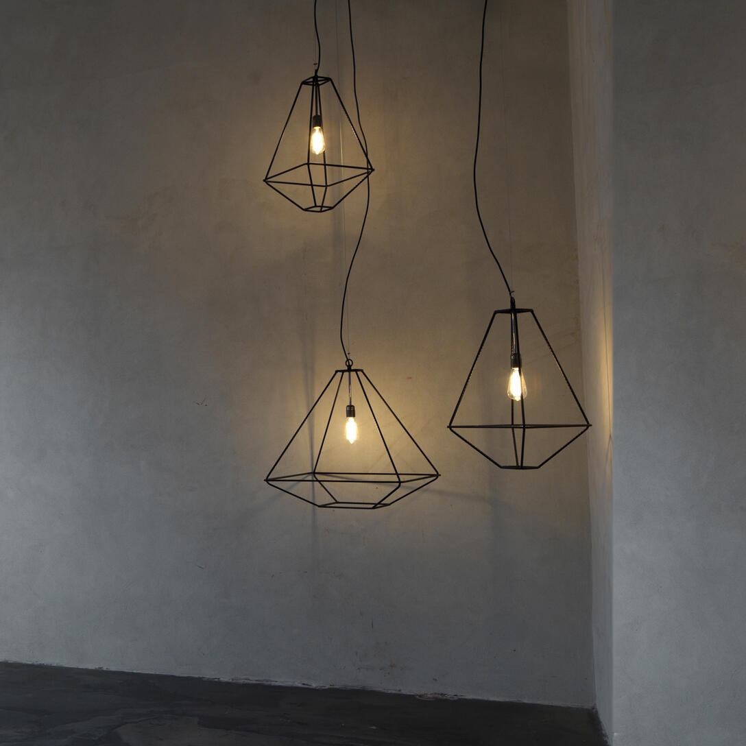 Leuchtende Laterne mit bearbeiteter Metallstruktur, Drahtstruktur in schwarzem Nickel-Finish. Quer: freistehend, wandmontiert oder hängend. Design Sara Bernardi Ausführungen: Schwarz RAL 9005.