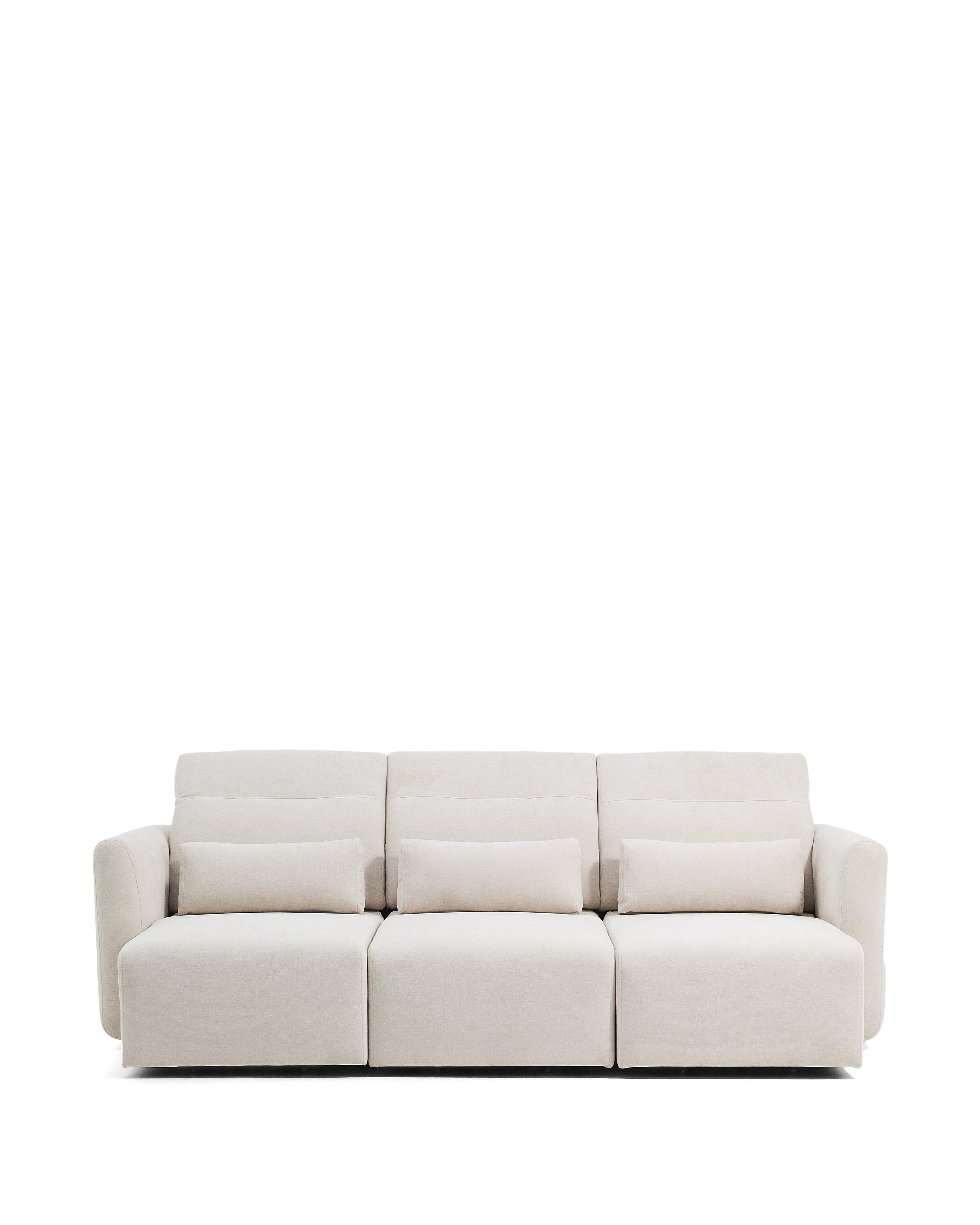 Dieses Sofa vereint Design, Komfort und Technologie in einem einzigen Möbelstück. Dank der motorisierten Sitze und der manuell verstellbaren Kopfstützen können Sie Ihre Haltung jederzeit anpassen. Es ist ein kompaktes Ausziehsofa, das die geringste Tiefe auf dem Markt mit maximaler Ausziehbarkeit im geöffneten Zustand kombiniert: Im geschlossenen Zustand ist es 99 cm tief und im geöffneten Zustand bis zu 60 cm ausziehbar. Die Sitzverlängerung kann in jeder Position geöffnet bleiben. Die Bewegung kann mit einer drahtlosen Fernbedienung oder über eine Bluetooth-fähige Smartphone-App gesteuert werden, die einen Sicherheitsmodus für eine kontrollierte Nutzung enthält. Der Chenille-Bezug mit feiner Struktur, samtigem Griff und ausgezeichneter Licht- und Abriebbeständigkeit ist im Schonwaschgang maschinenwaschbar. Der Stofflieferant ist nach OEKO-TEX® STANDARD 100 zertifiziert, was eine ökologisch unbedenkliche und umweltfreundliche Produktion garantiert. Im Inneren kombiniert der Sitz ein NOSAG-Federsystem mit Schichten aus hochdichtem Schaumstoff (35 kg/m³ und 40 kg/m³), 5 cm viskoelastischem Schaumstoff (42 kg/m³) und einer Faserschicht, was einen mittelweichen Sitz ergibt. Die Kopfstützen haben abnehmbare Bezüge und bestehen aus 35 kg/m³ Weichschaum, 24 kg/m³ Superweichschaum und Faser für mehr Komfort. Dieses in Europa hergestellte Sofa bietet Qualität und Langlebigkeit und trägt gleichzeitig zur Reduzierung der CO₂-Emissionen bei. Ein geräumiges und vielseitiges Möbelstück, das durchdachtes Design und Innovation in Ihren Alltag bringt.