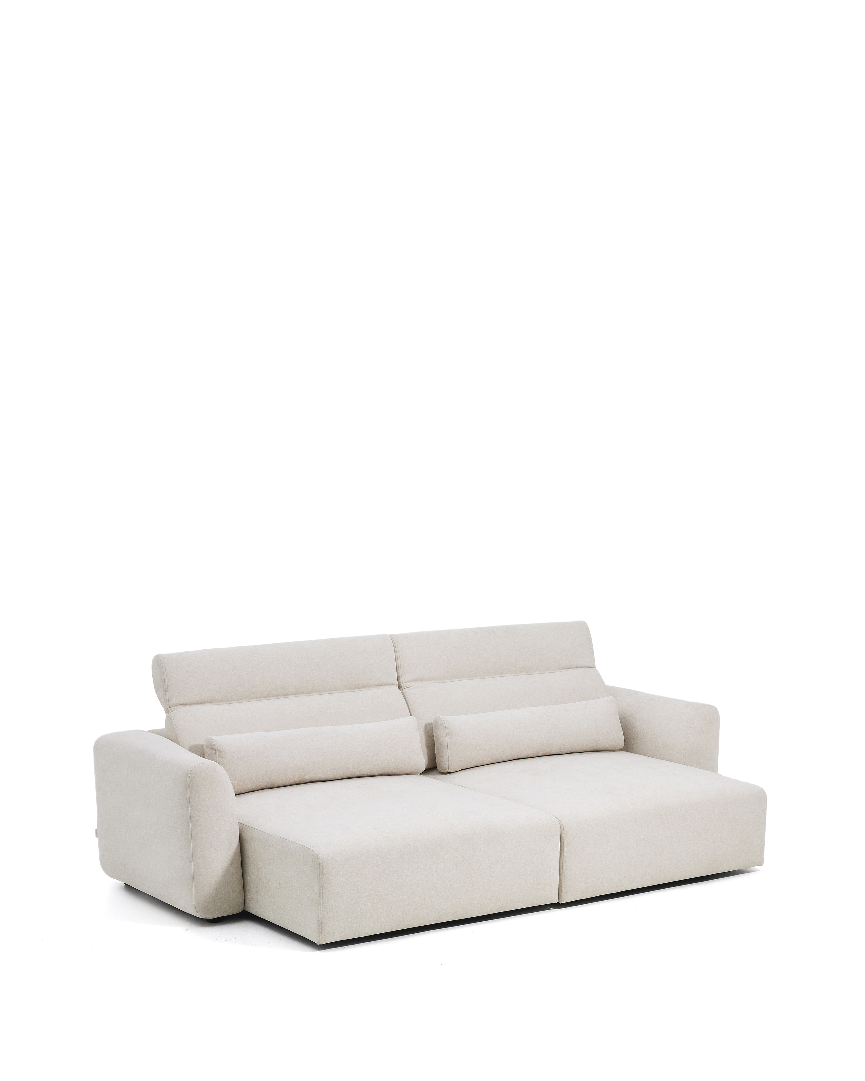 Dieses Sofa vereint Design, Komfort und Technologie in einem einzigen Möbelstück. Dank der motorisierten Sitze und der manuell verstellbaren Kopfstützen können Sie Ihre Haltung jederzeit anpassen. Es ist ein kompaktes Ausziehsofa, das die geringste Tiefe auf dem Markt mit maximaler Ausziehbarkeit im geöffneten Zustand kombiniert: Im geschlossenen Zustand ist es 99 cm tief und im geöffneten Zustand bis zu 60 cm ausziehbar. Die Sitzverlängerung kann in jeder Position geöffnet bleiben. Die Bewegung kann mit einer drahtlosen Fernbedienung oder über eine Bluetooth-fähige Smartphone-App gesteuert werden, die einen Sicherheitsmodus für eine kontrollierte Nutzung enthält. Der Chenille-Bezug mit feiner Struktur, samtigem Griff und ausgezeichneter Licht- und Abriebbeständigkeit ist im Schonwaschgang maschinenwaschbar. Der Stofflieferant ist nach OEKO-TEX® STANDARD 100 zertifiziert, was eine ökologisch unbedenkliche und umweltfreundliche Produktion garantiert. Im Inneren kombiniert der Sitz ein NOSAG-Federsystem mit Schichten aus hochdichtem Schaumstoff (35 kg/m³ und 40 kg/m³), 5 cm viskoelastischem Schaumstoff (42 kg/m³) und einer Faserschicht, was einen mittelweichen Sitz ergibt. Die Kopfstützen haben abnehmbare Bezüge und bestehen aus 35 kg/m³ Weichschaum, 24 kg/m³ Superweichschaum und Faser für mehr Komfort. Dieses in Europa hergestellte Sofa bietet Qualität und Langlebigkeit und trägt gleichzeitig zur Reduzierung der CO₂-Emissionen bei. Ein geräumiges und vielseitiges Möbelstück, das durchdachtes Design und Innovation in Ihren Alltag bringt.