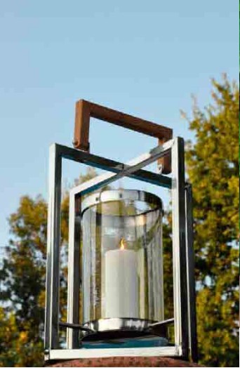 Laterne aus Edelstahl und Naturholz.