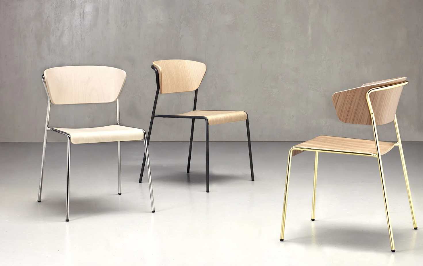 Sitz und Rückenlehne aus gebogenem Buchensperrholz verleihen Wärme und Eleganz, während die lackierte Stahlstruktur Stabilität und optische Leichtigkeit garantiert.