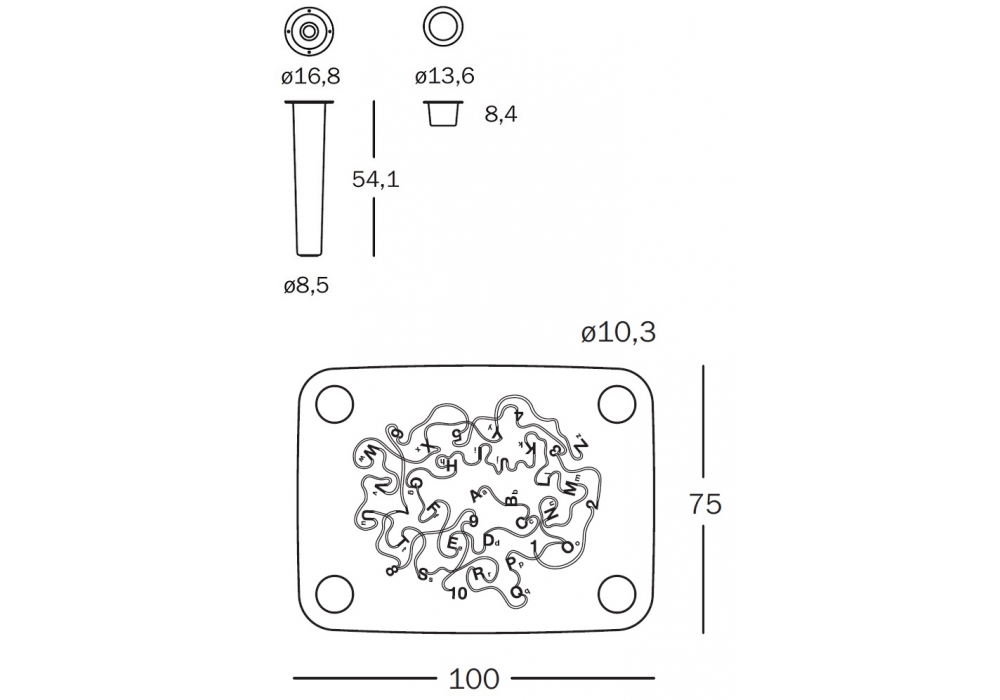 MDF-Oberseite mit perforiertem weißem Polymerblatt zur Aufnahme der orangefarbenen Stiftschalen und 4 Beine aus neutralem transparentem Polycarbonat. Dicke 60 cm.