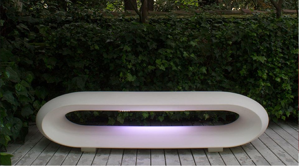 Ihr geschwungenes, schlichtes und einladendes Design besticht durch fließende und moderne Formen, während die integrierte LED-Beleuchtung der Bank eine eindrucksvolle Lichtpräsenz verleiht, ideal für Gärten, Terrassen, öffentliche Plätze, Hotels und Vertragsräume.